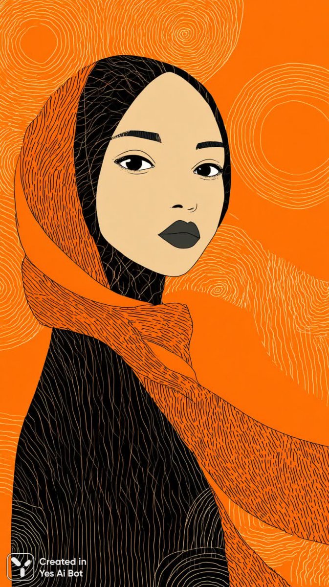 Изысканный портрет в духе конструктивизма и дадаизма, выполненный в технике чернильного рисунка с элементами иллюстрации. В центре композиции – двухмерное изображение женщины с ярким синим платком, ее лицо выражает серьезность и сосредоточенность. Взгляд устремлен прямо на зрителя, создавая эффект глубокой вовлеченности. Губы подведены насыщенной красной помадой, добавляя образу драматизма и акцентируя внимание на чувственности. Фоном служит вихреобразный узор, сотканный из градиентов оранжевого, желтого и черного цветов, что придает изображению динамику и глубину. Стиль работы явно вдохновлен африканским искусством, характеризующимся смелыми линиями, насыщенными цветами и декоративностью. Композиция сочетает в себе геометричность и строгость, присущие баухаузу, с провокационной свободой дадаизма, создавая уникальное визуальное впечатление. Портрет излучает силу, уверенность и загадочность, являясь ярким примером синтеза различных художественных направлений и культурных влияний. Работа выполнена с вниманием к деталям, демонстрируя мастерство художника в передаче эмоций и создании запоминающегося образа