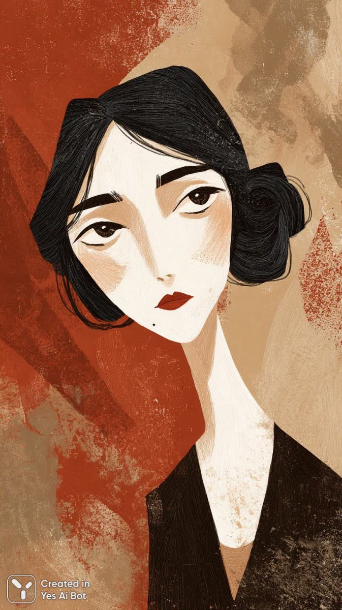 Элегантный портрет в духе экспрессионизма и конструктивизма, вдохновленный эстетикой Баухауса и принципами дадаизма. Изображение выполнено в технике тушевой графики, создающей эффект акварели с помощью плавных переходов цвета. Девушка с короткой темной стрижкой, собранной в высокую прическу, излучает спокойную уверенность и загадочность. Ее серьезный взгляд направлен вдаль, а чувственные губы подчеркнуты глубоким красным оттенком. Яркие акцентные детали – крупные красные и золотые серьги - добавляют образу выразительности и роскоши. Фон выполнен в теплых землистых тонах с абстрактными мазками кисти, напоминающими импрессионистские пейзажи. Композиция построена таким образом, чтобы подчеркнуть графическую строгость и лаконичность форм, характерные для стиля Баухаус, при этом сохраняя эмоциональную глубину и индивидуальность персонажа, свойственные дадаистическому искусству. Иллюстрация создает ощущение моментальной зарисовки, передающей атмосферу творческого поиска и экспериментов. Портрет наполнен внутренней силой и достоинством, а сочетание графических элементов и цветовой палитры придает ему особую выразительность и эстетическую привлекательность. Картина словно рассказывает историю о сильной и независимой женщине, живущей в эпоху перемен и творческого бунта