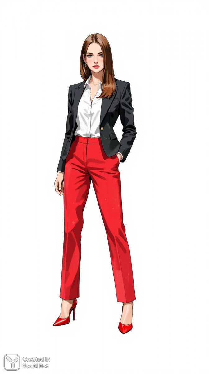 Изящный силуэт современной женщины в стильной модной иллюстрации. На ней идеально скроенный блейзер, подчеркивающий безупречный вкус, под которым – свежая белая блузка, добавляющая образу легкости и элегантности. Яркие красные брюки и туфли на высоком каблуке создают дерзкий акцент, а длинные прямые волосы завершают этот запоминающийся образ уверенности и профессионализма. Фон в белоснежном цвете позволяет полностью сосредоточиться на деталях костюма и выразительной позе модели, что делает иллюстрацию идеальным сочетанием классической элегантности и современной моды. Этот образ воплощает собой гармонию между деловым стилем и современными тенденциями, демонстрируя смелость и уверенность в себе. Иллюстрация передает ощущение динамики и энергии, отражая современный взгляд на женскую моду и стиль жизни. Это идеальный пример того, как можно выглядеть одновременно профессионально и модно, не жертвуя индивидуальностью и своим уникальным стилем