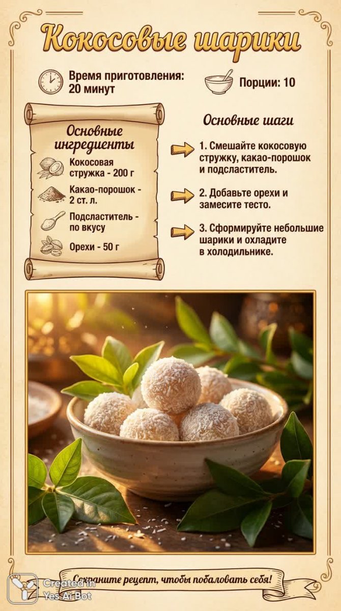 Легкий и полезный десерт для тех, кто следит за фигурой – кокосовые шарики собственного приготовления! Этот простой рецепт займет всего 20 минут вашего времени, а результат порадует вас нежным вкусом и приятной текстурой. В основе лакомства - ароматная кокосовая стружка, насыщенный какао-порошок и по желанию – сахарозаменитель для сладости. Для хрустящей нотки добавлены орехи, которые придают шарикам дополнительную питательность и интересный вкус. Процесс приготовления настолько прост, что справится даже начинающий кулинар: смешайте сухие ингредиенты, сформируйте небольшие шарики и отправьте их в холодильник для охлаждения – готово! Идеальный перекус или десерт после обеда, который станет настоящим украшением вашего стола. Побалуйте себя и своих близких этим восхитительным лакомством, которое легко приготовить дома. Насладитесь нежным сочетанием кокоса и какао, дополненным хрустящими орехами – это идеальный способ порадовать себя без лишних угрызений совести. Фотографии демонстрируют аппетитные шарики в стильной чаше, окруженные зеленью, создавая атмосферу уюта и наслаждения. Обязательно сохраните этот рецепт, чтобы всегда иметь под рукой простой и вкусный десерт!