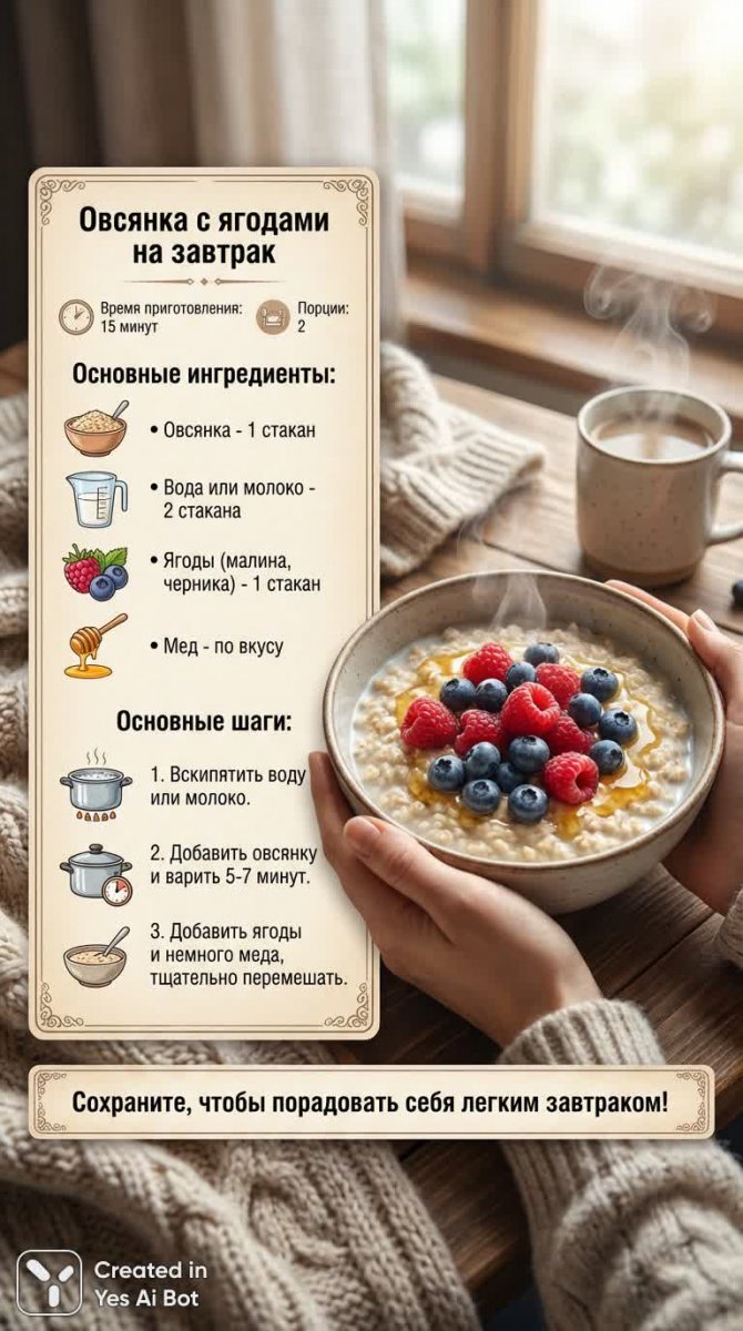 Визуально представлен уютный утренний кадр, где изображена порция овсянки с ягодами в руке, созданная нейросетью Nano Banana v.1.0 Pro. Иллюстрация выполнена в детализированном стиле и передает атмосферу спокойствия и тепла, идеально подходящую для начала дня. Рекомендуется сохранить рецепт для быстрого приготовления полезного завтрака в любое время.