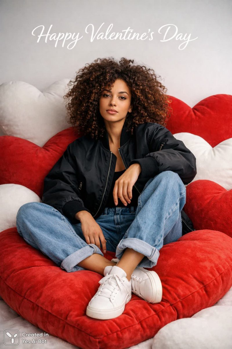 high detail, woman with voluminous curly hair, wearing black bomber jacket and relaxed fit blue jeans, sitting on oversized heart-shaped pillows, calm confident gaze, minimalist sneakers, soft diffused lighting, red accents in pillows, "happy valentine's day", camera: fuji x-t4, lens: 23mm f/1.4, settings: iso 400, f/2.8, 1/125s.