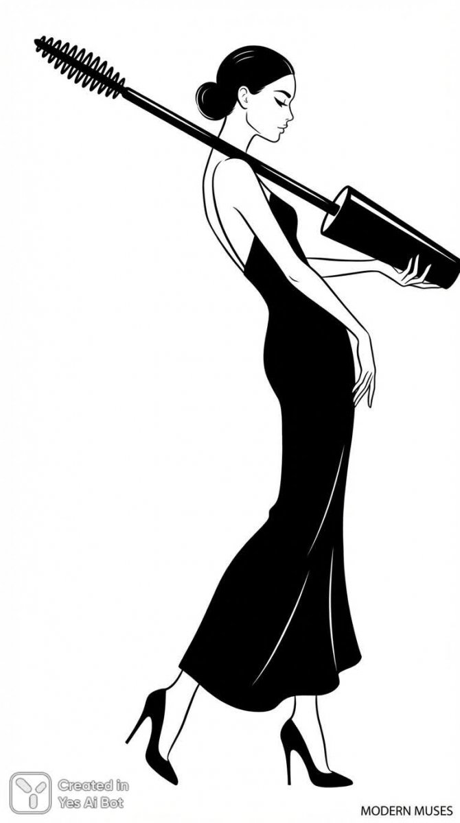 minimalist fashion illustration, woman with hair in bun, elegant pose in black dress, holding giant mascara brush, high heels, sleek long legs, white BG, line art style, modern sketch.