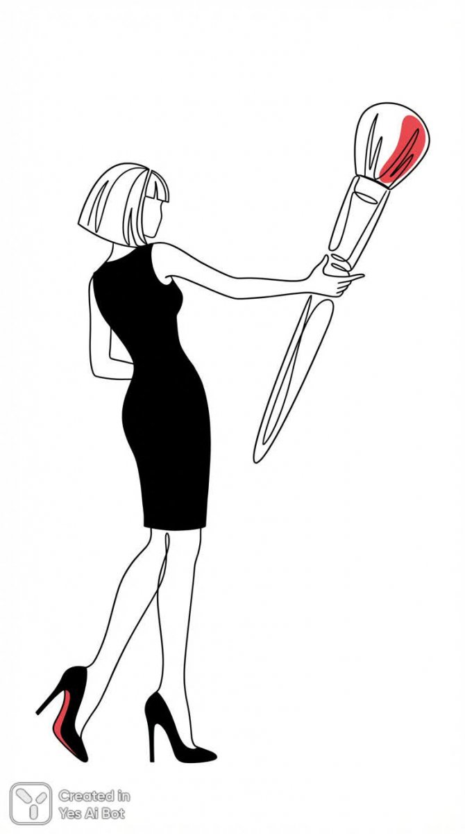 Изысканная элегантность в каждой детали: современный минимализм воплощен в образе уверенной женщины с короткой стрижкой, подчеркнутой идеально сидящим черным платьем. Ее поза – это символ силы и стиля, рука изящно вытянута, а в ней – крупная кисть для макияжа, словно орудие создания совершенства. Высокие каблуки добавляют образу динамики и подчеркивают безупречный вкус. Игра контрастов создает визуальную гармонию: лаконичность линий сочетается с акцентами, привлекающими внимание к деталям. Фон – чистый белый цвет, который позволяет сосредоточиться на главном – эстетике образа. Тонкие линии рисунка придают фотографии завершенность и графическую изысканность, превращая ее в настоящее произведение современного искусства. Этот кадр – ода минимализму и женской силе, где каждая деталь продумана до мелочей, а результат поражает своей простотой и безупречным вкусом. Это не просто фотография, это визуальная декларация элегантности и уверенности в себе