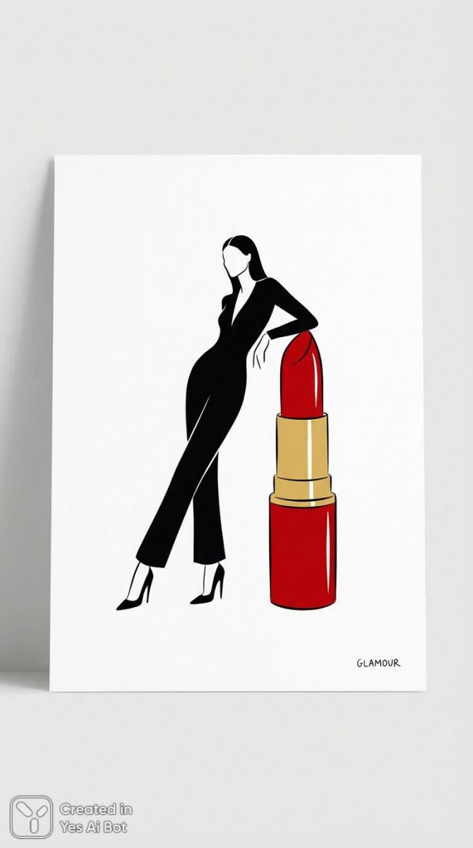 Изысканная иллюстрация, воплощающая современную элегантность и смелый акцент на деталях. В центре композиции – стилизованный образ женской фигуры в лаконичном черном комбинезоне, создающий ощущение уверенности и минимализма. Фигура грациозно опирается на увеличенный красный блеск для губ, становясь символом гламура и соблазна. Акцент сделан на ярких, насыщенных цветах, контрастирующих с чистым белым фоном, что подчеркивает графичность изображения. Длинные ноги и изящная обувь на высоком каблуке добавляют образу динамики и модной привлекательности. Иллюстрация выполнена в современном стиле, сочетая абстрактные формы и детализированную проработку, создавая эффектное визуальное впечатление, идеально подходящее для рекламных кампаний или оформления модных изданий. Это произведение искусства передает дух современной моды, выделяясь своей чистотой линий и смелыми цветовыми решениями