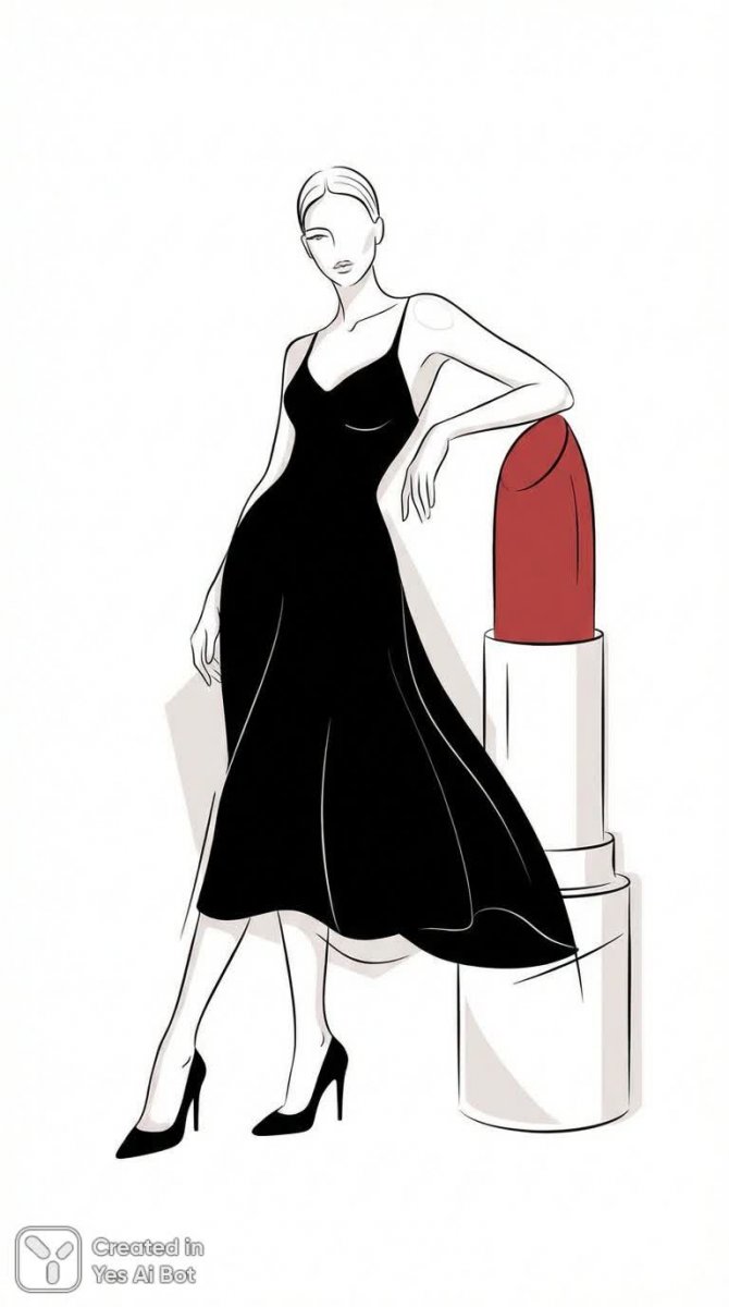 На изображении представлена минималистичная иллюстрация стройной женщины в элегантном черном платье и высоких каблуках, выполненная нейросетью Nano Banana. Фигура девушки занимает центральное место на фоне чистого белого пространства, что позволяет акцентировать внимание как на ее изящной позе, так и на деталях образа. Одна рука опирается на увеличенный тюбик помады, добавляя изображению игривости и подчеркивая связь с миром красоты и косметики.