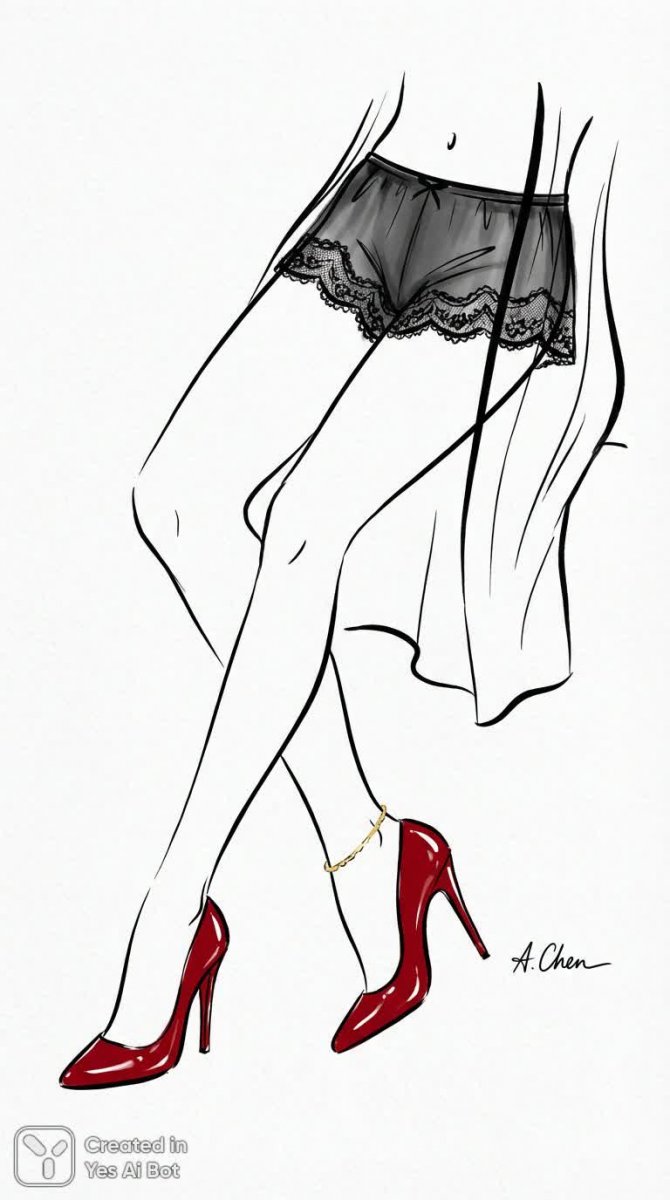 Изысканная мода в деталях: завораживающая иллюстрация демонстрирует женственность и элегантность. В центре внимания – грациозная фигура женщины, облаченной в роскошное черное кружевное белье, подчеркивающее плавные линии тела. Скрещенные ноги создают эффектную позу, а ярко-красные лаковые высокие каблуки добавляют образу дерзости и сексуальности. Минималистичный белый фон акцентирует внимание на деталях – совершенство линий, изящность кружева, блеск лака. Стиль исполнения – четкий и лаконичный рисунок линией, характерный для современной модной иллюстрации. Композиция выстроена таким образом, чтобы максимально подчеркнуть красоту ног и акцентировать внимание на аксессуарах. Вся работа пронизана чувственностью и современностью, передавая атмосферу утонченной роскоши и уверенности в себе. Это не просто иллюстрация – это визуальная ода женской грации и безупречному вкусу, воплощенная в элегантном сочетании черного кружева и ярко-красного акцента на фоне чистого белого полотна. Искусство линий создает впечатление легкости и воздушности, делая образ еще более привлекательным и запоминающимся. Каждая деталь продумана до мелочей, создавая гармоничный и завершенный визуальный ряд, который вызывает восхищение своей простотой и изысканностью