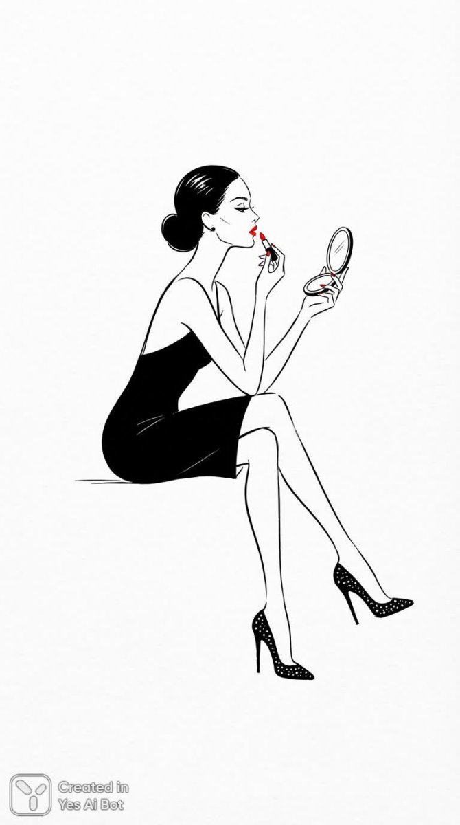 chic minimalist sketch of female figure in black dress, hair in bun, sitting with red lipstick and mirror, elegant posture, high heels with rhinestones, clean lines, emphasized silhouette, bright illustration.