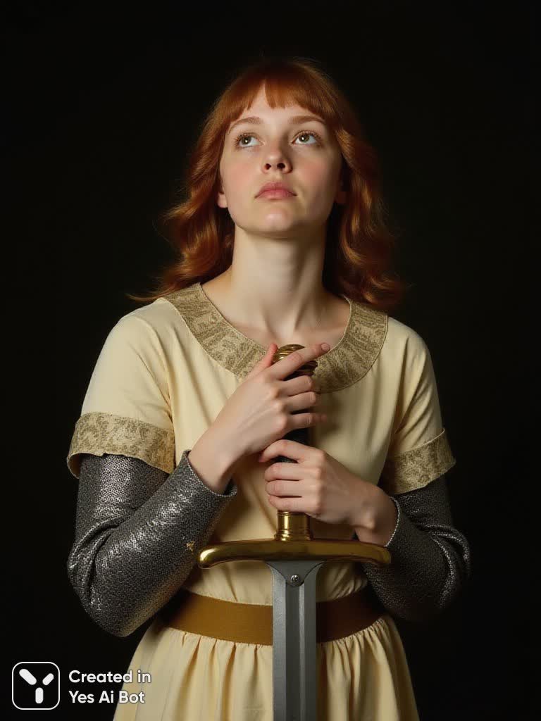 Portrait of a young woman, teenage age, in a classic historical style. The model, of European descent, looks up with a serene, reverent expression. Her chestnut hair, styled in soft waves, frames her face with a delicate fringe. She wears a cream-colored tunic adorned with a decorative collar and a metal chainmail sleeve on her left arm. A gold belt encircles her waist, and she holds a medieval sword in her right hand. Her left hand rests on her chest. The background is a dark, shaded space, creating a dramatic contrast that emphasizes the model's image. The lighting appears soft, with an emphasis on the face and upper body. The composition i...