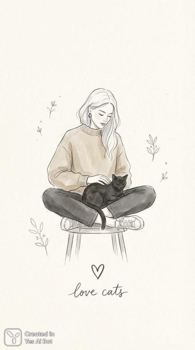 fashionable minimalist woman in casual outfit with a black cat on her lap, affectionate pose, "lоve cats" typography, simple sketch style, light and airy BG.
