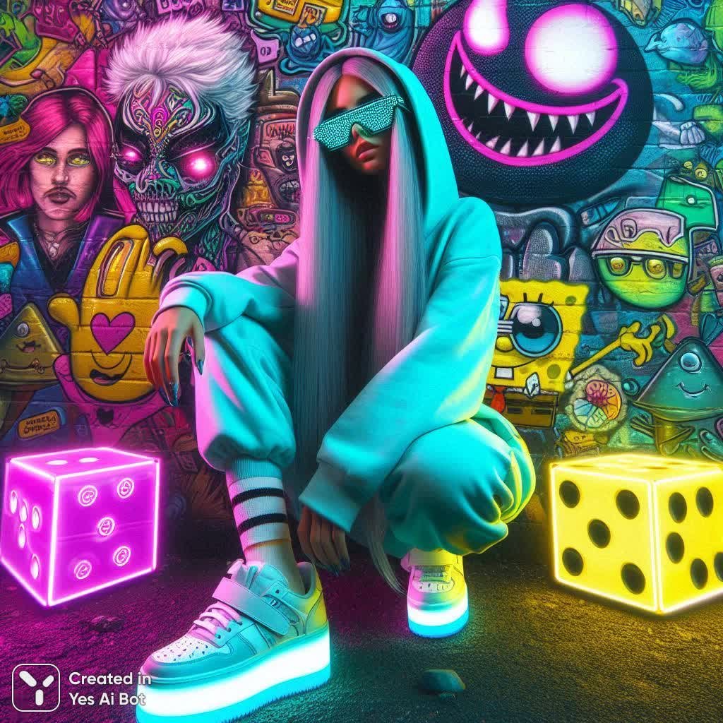 Неожиданное слияние эпох и стилей: аналоговая эстетика пленочной фотографии встречается с киберпанковской реальностью. В центре внимания – ослепительная девушка, словно сошедшая со страниц комикса или с экрана фильма Веном. Ее образ – дерзкое сочетание спортивного костюма худи и эффектных белых кроссовок на платформе, дополненное стильными круглыми солнцезащитными очками с бирюзовым светоотражением и банданой, скрывающей рот и нос под слоем комиксных надписей. Над головой девушки парят светящиеся фиолетово-синие игральные кубики, напоминающие персонажей SpongeBob And Patrick в стиле Pixar, создавая сюрреалистичный и запоминающийся образ. Фон картины – буйство кислотного граффити, выполненного в ярких лаймово-желтых, синих и фиолетовых тонах, а внизу клубы густого дыма неонового зеленого и фиолетового цвета добавляют драматизма и глубины композиции. Этот снимок – воплощение смелого сочетания аналоговой зернистости, эффекта фотовспышки и ярких кислотных цветов, создающих поистине уникальную и захватывающую атмосферу неонового киберпанка, где реальность переплетается с фантазией, а прошлое встречается с будущим. Картина излучает энергию молодости, бунтарства и дерзкого стиля, оставаясь в памяти ярким визуальным впечатлением