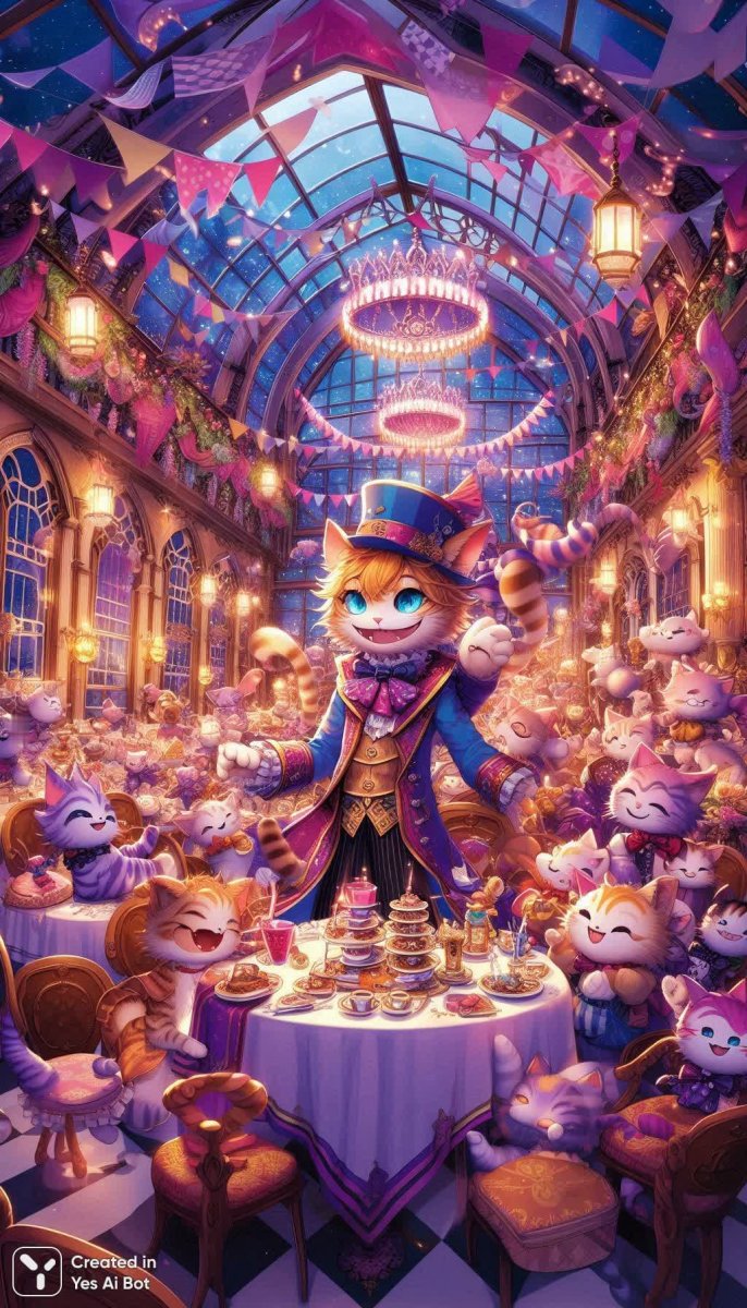 A detailed anime set in the world of Alice in Wonderland. The Cheshire Cat is at a Cheshire party, a large house, festive bunting, numerous Cheshire cats led by the main Cheshire Cat holding a glass of valerian in his paw, a festive atmosphere, and the party is illuminated by pink and soft purple spotlights. A detailed anime.