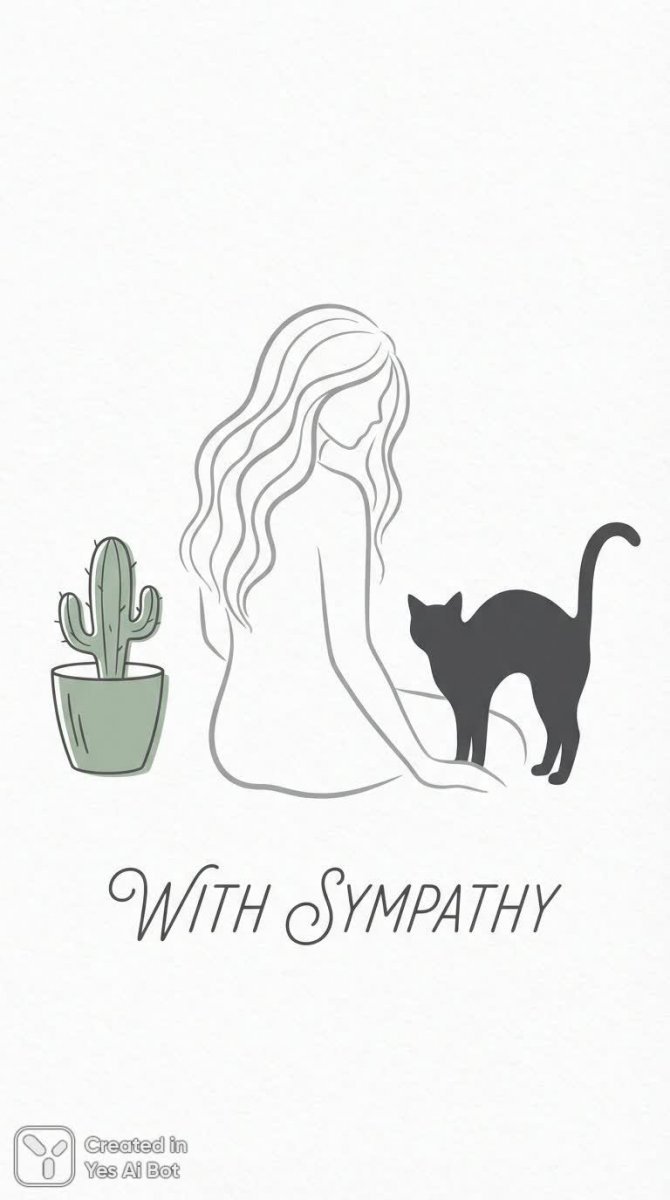girl with long hair sitting next to black cat, minimalist illustration, cactus in background, love theme, simple line art, elegant design, soft colors, clean white BG.