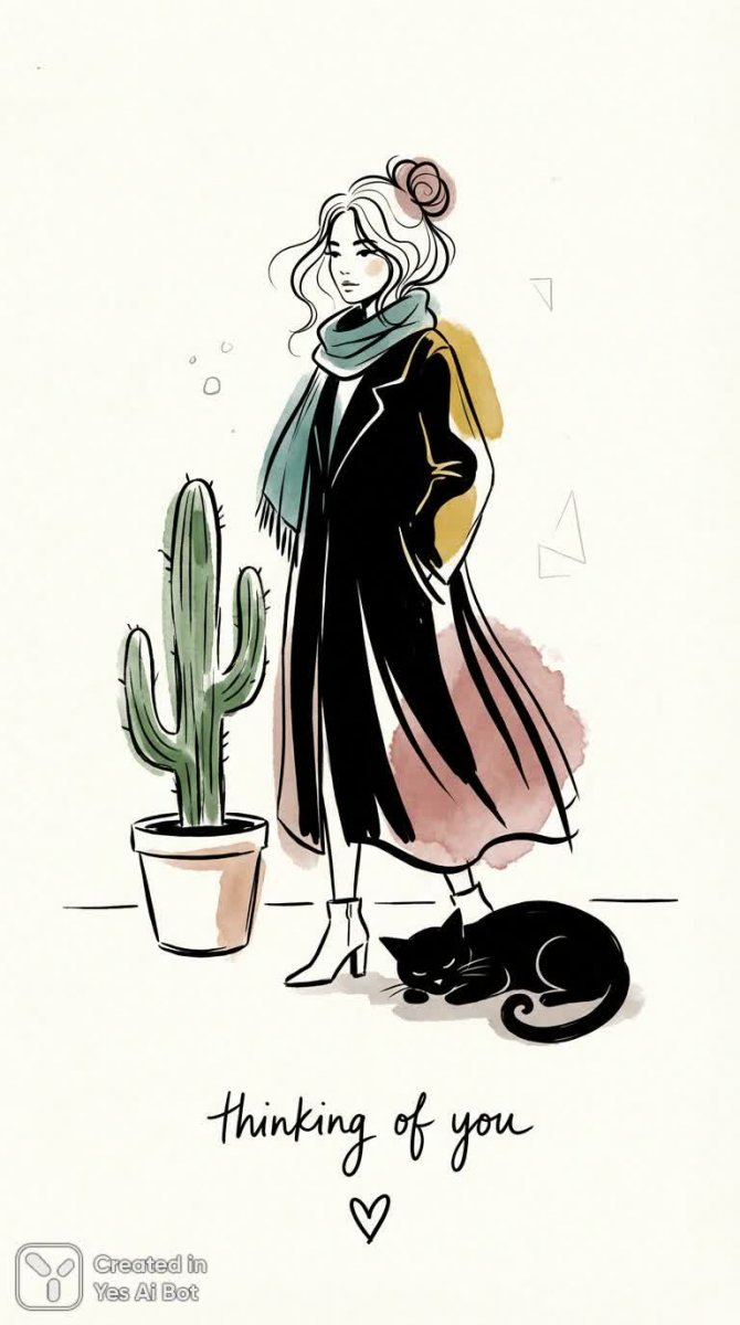 Изящная женщина с развевающимися волосами в окружении минималистичной атмосферы – это воплощение современной элегантности и утонченного стиля. В композиции чувствуется легкость и безмятежность, подчеркнутые чистыми линиями рисунка и яркими акцентами цвета. Черный кот, уютно свернувшийся к ее ногам, добавляет сцене тепла и домашнего очарования, создавая атмосферу нежной привязанности и заботы. Расположенный на заднем плане кактус символизирует стойкость, жизнелюбие и гармонию с природой. Вся картина пронизана игривым настроением и романтической атмосферой, словно приглашая зрителя окунуться в мир грез и фантазий. Это современный эскиз, выполненный с безупречной точностью линий, где каждая деталь играет важную роль в создании общей картины – визуального символа любви, красоты и гармонии. Нарисованная картина передает ощущение спокойствия и радости, заставляя задуматься о простых, но таких важных вещах: красоте окружающего мира, верности близких и важности момента. Стиль исполнения делает изображение современным и актуальным, а яркие цветовые акценты придают ему живость и выразительность, не перегружая общую композицию. Эта работа – прекрасный пример того, как минимализм может быть наполнен глубоким смыслом и эстетической привлекательностью, являясь отражением современного видения мира