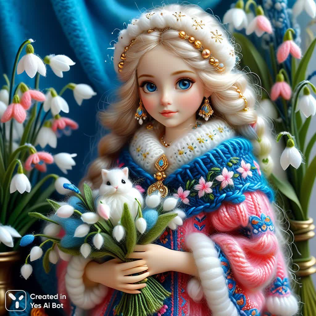 Волшебный мир вязаных фантазий оживает в этом очаровательном изображении! Нежная девушка с небесно-голубыми глазами, словно сошедшая со страниц сказки, утопает в пушистом великолепии мохерового платья и изящного ажурного шаля. Ее окружает заснеженный пейзаж, сотканный из мягких хлопьев и искрящихся снежинок, создавая атмосферу зимней безмятежности и волшебства. В руках она бережно держит букет нежных подснежников – символ весны и надежды среди суровых холодов. Изображение пронизано наивным искусством, где каждый элемент выписан с любовью и вниманием к деталям. Бесчисленное множество деталей, таких как жемчуг, золотые и серебряные нити, акценты оливкового, розового и голубого цветов, придают работе неповторимый шарм и глубину. Использование различных материалов – от нежнейшего ангора до пушистого меха – создает ощущение тактильного комфорта и визуальной мягкости. Белые кеды добавляют образу легкости и игривости, а чистый фон позволяет полностью сосредоточиться на красоте и утонченности главной героини и ее окружения. Это произведение искусства – настоящий праздник для глаз, воплощение тепла, нежности и зимней сказки в каждом связанном узоре. Картина источает ощущение радости и волшебства, погружая зрителя в мир грез и фантазий