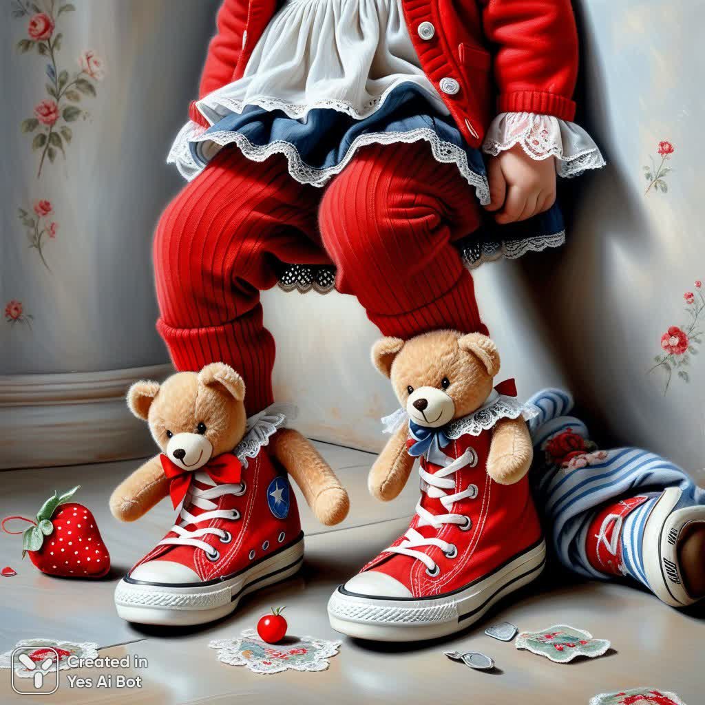 Нежная пастельная зарисовка детства, пронизанная атмосферой уюта и беззаботности. На фоне светло-серого полотна – маленькие ножки в ярких красных кедах Converse с развязанной шнуровкой и полосатых гольфах до колен. Это мгновение запечатлено с особой теплотой и трепетом, словно художник стремится сохранить хрупкость и неповторимость детской непосредственности. Рядом, чуть тронув изображение, детская ручка бережно удерживает потрепанного плюшевого мишку – верного друга со множеством заплаток, свидетельствующего о бесчисленных играх и приключениях. Видны следы времени на любимой игрушке, которые лишь добавляют ей очарования и ценности. Вся композиция пронизана наивной простотой и искренностью, характерной для творчества Wiebke Rauers. Ее узнаваемый стиль, отличающийся мягкостью линий и приглушенными тонами, создает ощущение умиротворения и ностальгии. Картина словно шепчет о счастливом детстве, наполненном играми, мечтами и теплом родительского дома. Это не просто изображение – это зарисовка воспоминаний, способная вызвать самые светлые чувства и перенести в мир беззаботности и радости. Каждый элемент, от ярких кед до потертого мишки, рассказывает свою историю, сплетаясь в единую трогательную картину. Пастельные тона создают ощущение легкости и воздушности, а мастерское владение материалом позволяет передать мельчайшие детали с невероятной точностью. Эта работа – дань уважения детству и всем тем теплым моментам, которые мы храним в своем сердце