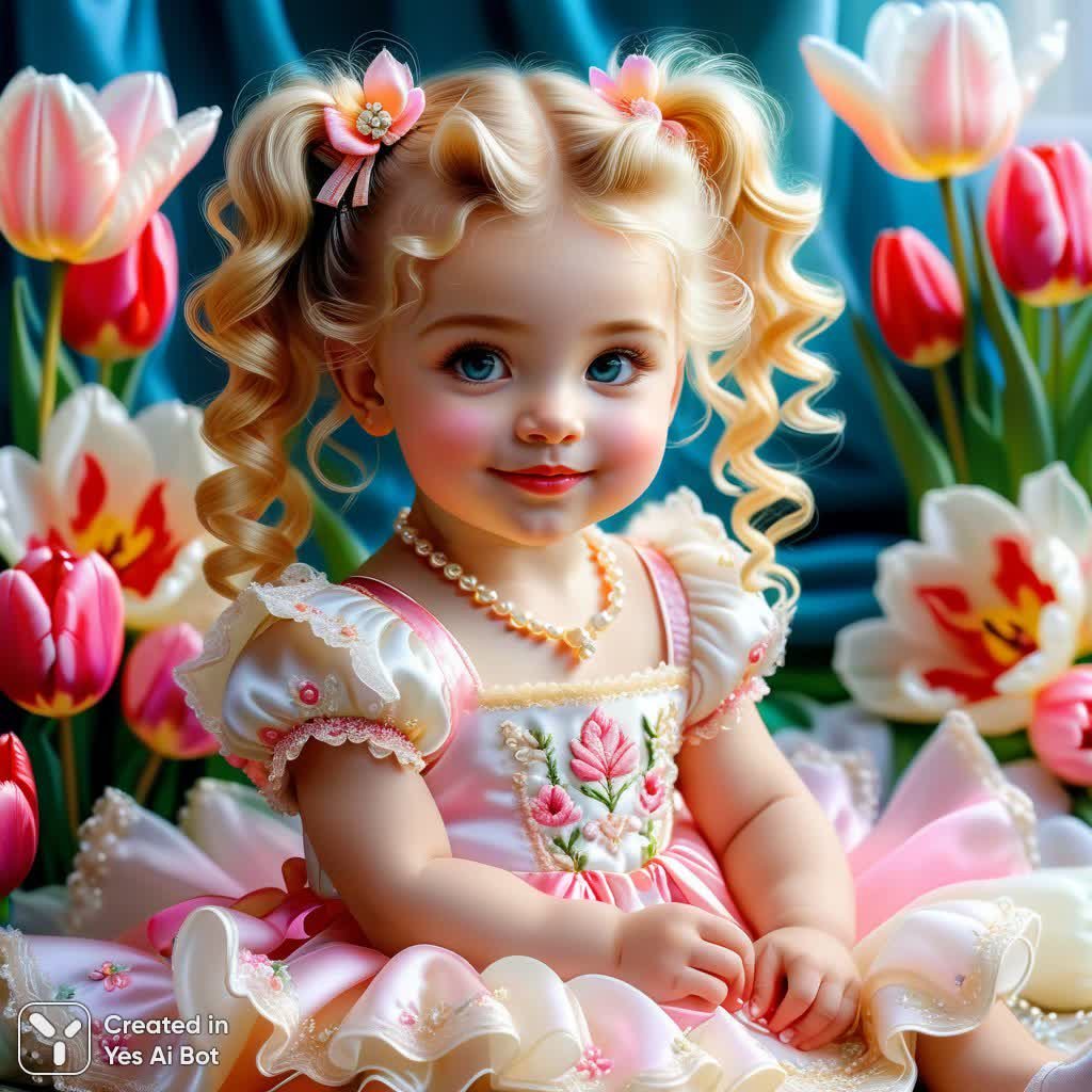 Нежная весенняя вышивка шелковыми нитями, украшенная мехом, кружевом и пушком с плавным переходом на атласе. В центре композиции – очаровательный маленький ребенок с кудрявыми светлыми волосами и двумя хвостиками, завязанными бантами. Он сидит в изящном цветке тюльпана, словно оживший бутон, облаченный в воздушное платье с жемчугом и бисером, украшенное цветами тюльпанов. Палитра выполнена в нежных пастельных тонах: белый, молочный и неоновые акценты создают ощущение легкости и волшебства. Эта работа – воплощение деликатности и красоты весеннего пробуждения, где детская улыбка сочетается с изысканностью материалов и мастерством исполнения. Изящные шелковые нити словно танцуют на атласной основе, подчеркивая плавность линий и нежность образа. Мягкий мех и воздушное кружево добавляют текстуры и объема, создавая ощущение тепла и уюта. Неоновое свечение придает изображению современный акцент, делая его по-настоящему уникальным произведением искусства. Это визуальная ода весне, детству и красоте, сотканная из самых лучших материалов и наполненная любовью к деталям. Каждый элемент тщательно продуман и выполнен с максимальной точностью, чтобы передать всю прелесть момента и создать незабываемое впечатление