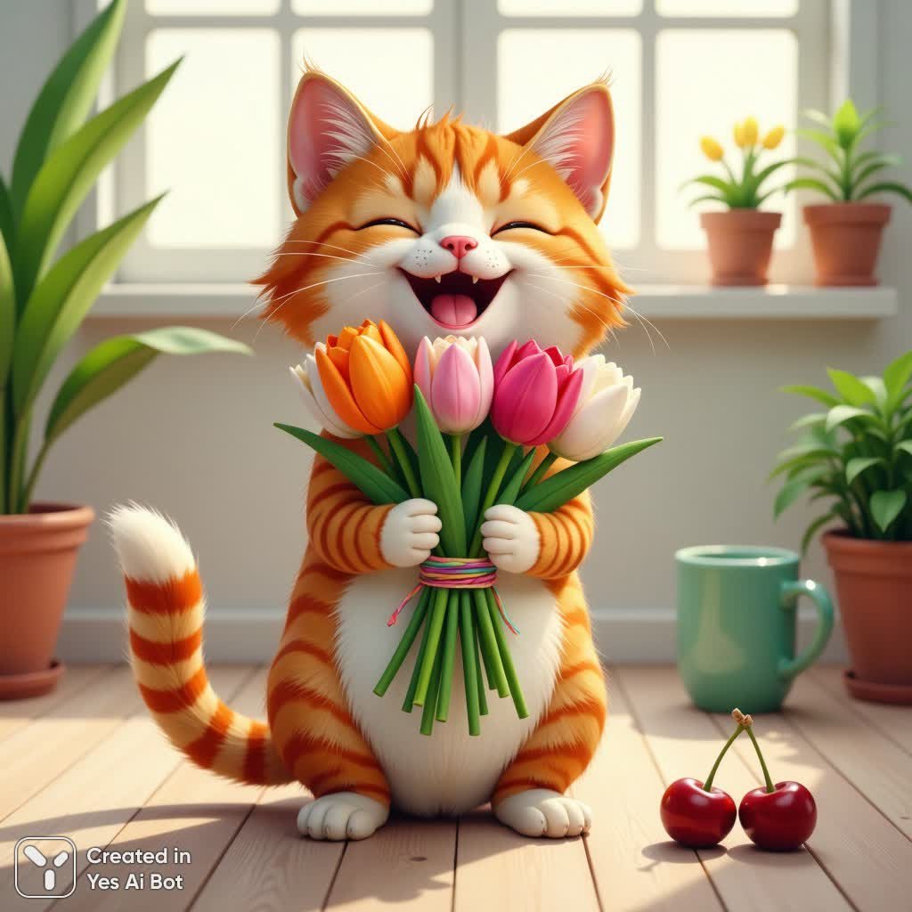 A charming, lively ginger cat with a bright bouquet of tulips. The cat's fur is a warm mixture of orange and white with distinct stripes. Its expression is one of pure joy, its eyes closed in bliss, a wide smile revealing a tiny pink nose and a hint of a smile. The cat's paws hold a colorful bouquet of tulips, a mixture of pink, orange, white, and yellow flowers tied with green and pastel string. The cat stands on a light wooden floor. Soft, natural light streams in from the window in the background, subtly illuminating the scene and casting soft shadows. Dark red cherries lie on the wooden floor, adding a bright accent in the lower right cor...