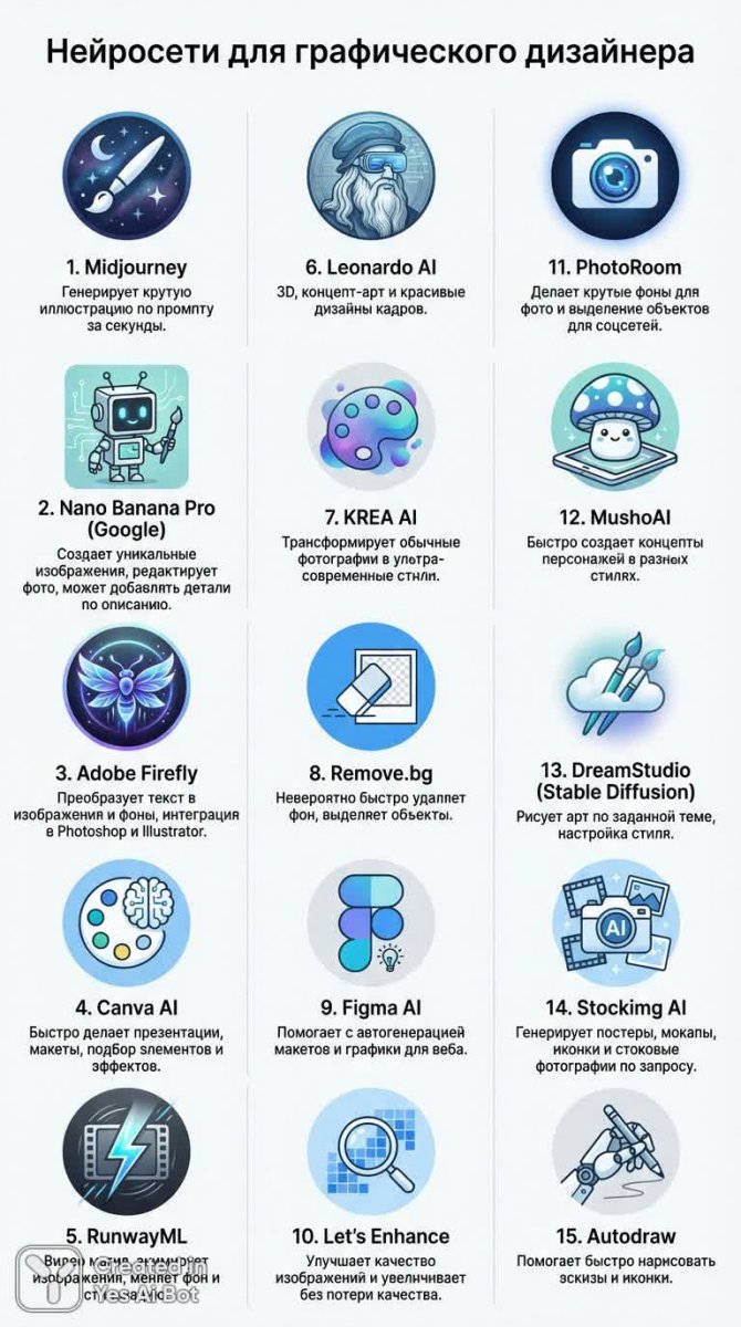 Инфографика представляет собой обзор полезных нейросетей, которые значительно упрощают работу графического дизайнера, предлагая широкий спектр инструментов для создания визуального контента. От генерации иллюстраций до редактирования фотографий и автоматизации рутинных задач — эти платформы открывают новые возможности для творчества и повышения эффективности. Midjourney выделяется способностью мгновенно создавать потрясающие иллюстрации на основе текстовых запросов, а Nano Banana Pro (Google) предлагает уникальные изображения и интеллектуальное редактирование. Adobe Firefly интегрируется с популярными графическими редакторами Photoshop и Illustrator, позволяя преобразовывать текст в визуально привлекательные изображения и фоны. Canva AI ускоряет создание презентаций и макетов, предоставляя готовые элементы и эффекты. RunwayML демонстрирует магию видео, анимируя картинки и изменяя фон. Leonardo AI специализируется на 3D-ассетах и концепт-арте, а KREA AI преобразует обычные фотографии в ультрасовременные стили. Удаление фона или выделение объектов становится простым благодаря Remove.bg. Figma AI автоматизирует создание макетов для веб-дизайна, а Let's Enhance повышает качество изображений без потери разрешения. PhotoRoom позволяет легко создавать привлекательные фотофон и выделять объекты для социальных сетей. MushoAI быстро генерирует концепты персонажей в различных стилях, DreamStudio (Stable Diffusion) рисует арты на заданные темы с возможностью кастомизации. Stockimg AI создает постеры, мокапы и фотографии для стоков, а Autodraw помогает быстро создавать скетчи и иконки. В совокупности эти нейросети предоставляют графическим дизайнерам мощный набор инструментов для оптимизации рабочего процесса, расширения творческих возможностей и создания визуально привлекательного контента в различных стилях. Они становятся незаменимыми помощниками в современной графической индустрии, позволяя реализовать самые смелые идеи с минимальными усилиями
