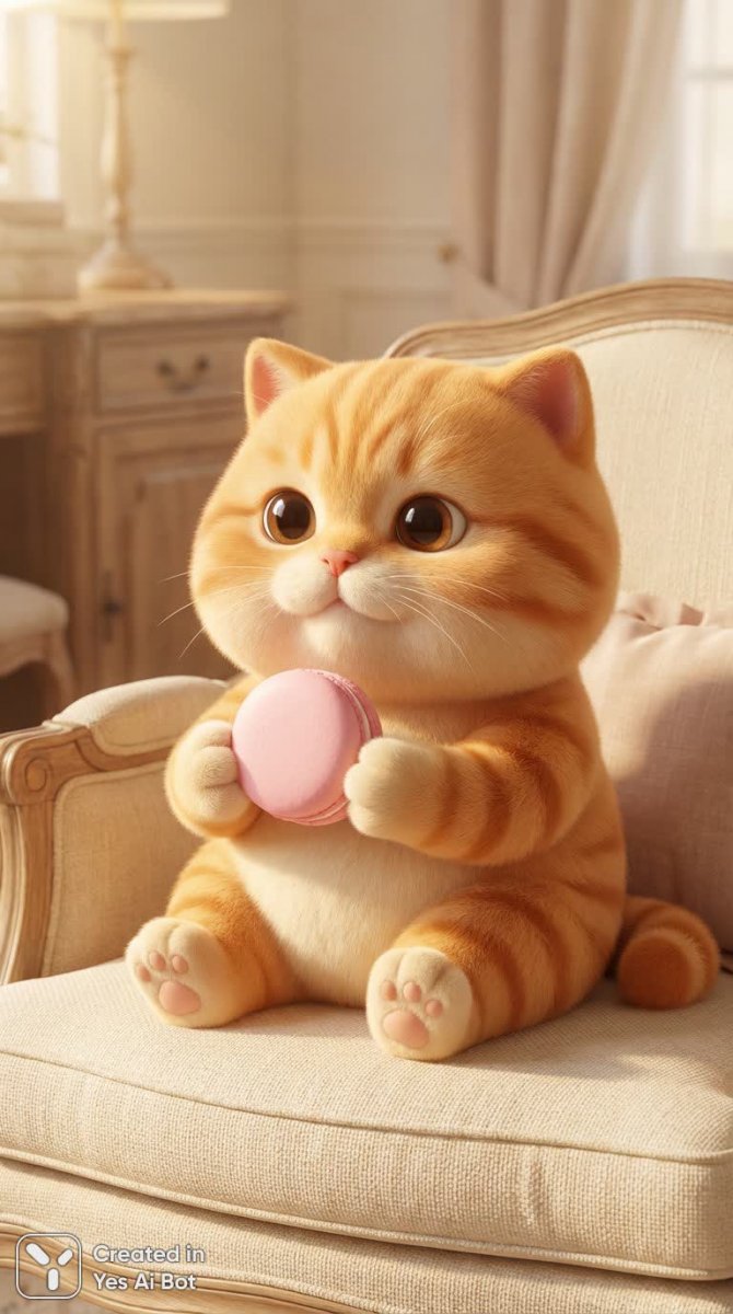 cute fluffy orange cat, chubby cheeks, holding macaron in paws, big expressive eyes, sitting on vintage interior BG, high quality image, photorealistic detailing, warm tones, 3d illustration style, close-up