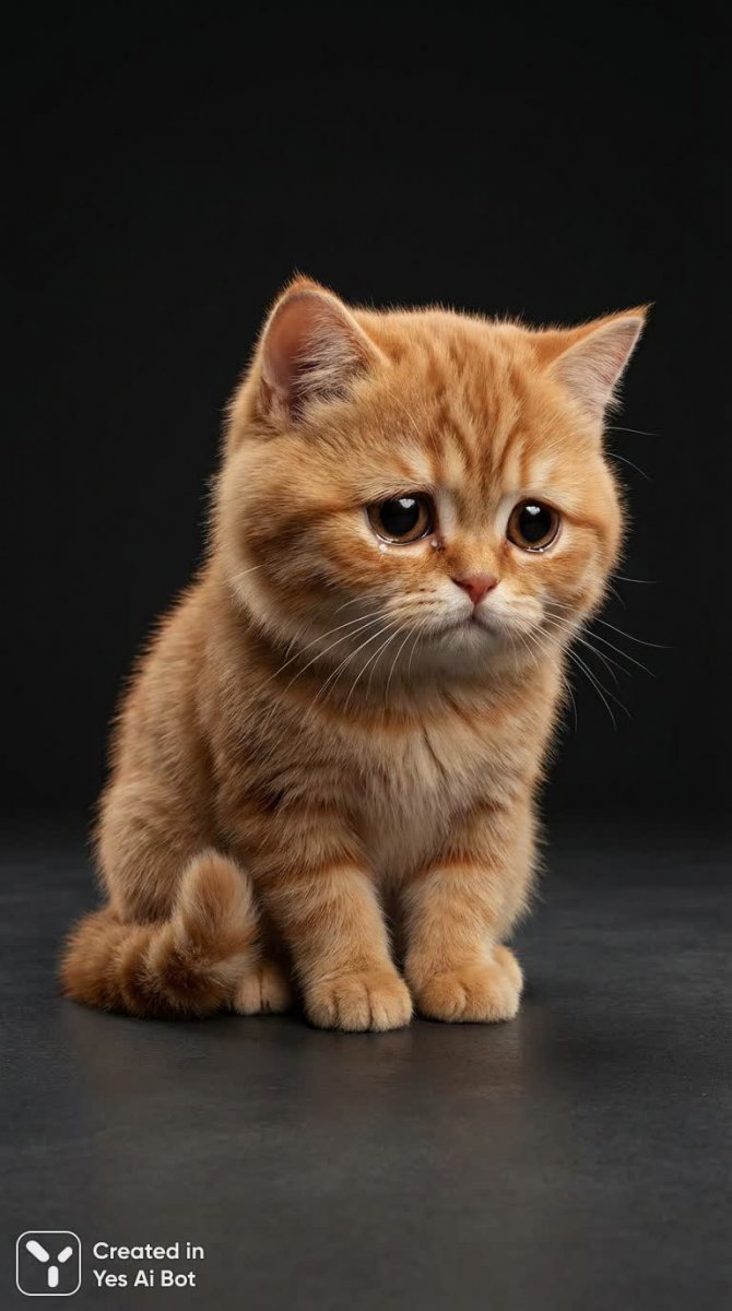 Задумчивый взгляд рыжего кота. Этот пушистый апельсиновый красавец, с невероятно большими и печальными глазами, кажется погружен в свои мысли, сидя на темном полу. Фон – угольно-черный, что позволяет полностью сосредоточиться на выразительном лице животного. Реалистичная текстура шерсти передает мягкость и пушистость каждого волоска, а рассеянный свет подчеркивает глубину взгляда и создает ощущение уюта и тепла. Стиль студийной съемки, с акцентом на деталях и крупным планом, позволяет рассмотреть мельчайшие нюансы мордочки кота – от легкой складки между бровями до едва заметных теней вокруг глаз. Камера Canon EOS R5 запечатлела этот момент с потрясающей четкостью и детализацией, создавая ощущение присутствия рядом с этим трогательным котом. Вся композиция пронизана чувством меланхолии и нежности, вызывая желание обнять этого пушистого друга и утешить его печалью. Изображение обладает особой эмоциональной силой благодаря сочетанию реалистичной текстуры и выразительной мимики, передающей сложный внутренний мир кота
