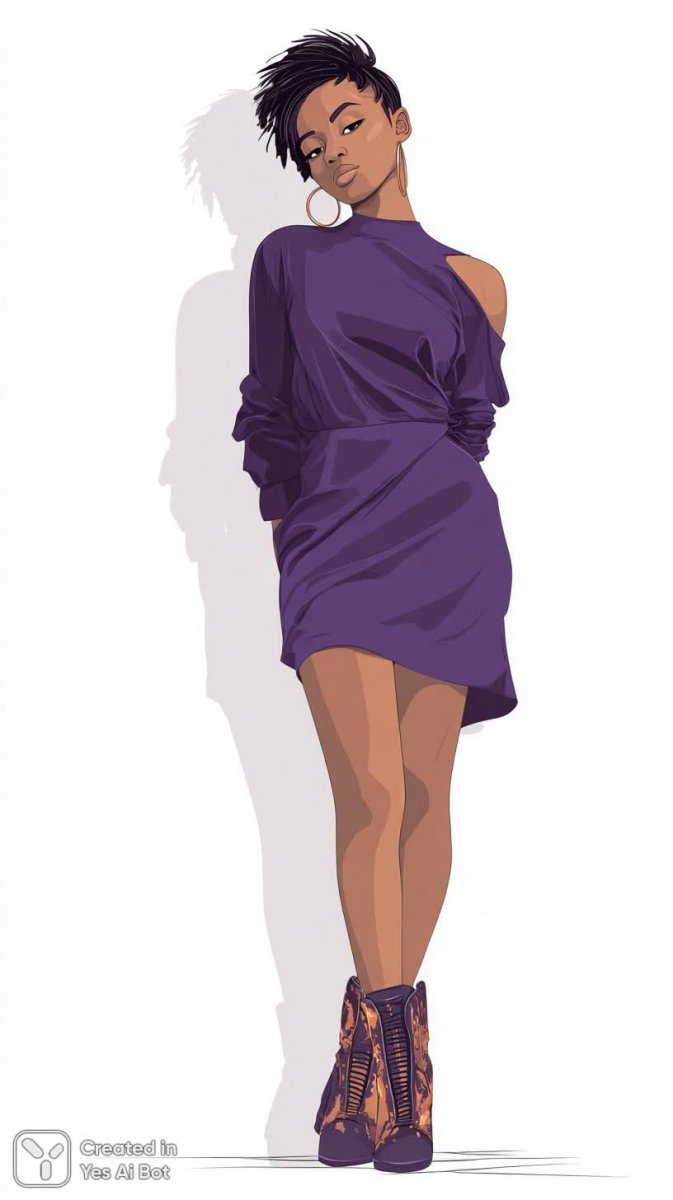 Завораживающая цифровая иллюстрация демонстрирует молодую женщину в смелом и стильном образе. Её короткое пурпурное платье приковывает взгляд необычным вырезом, добавляя образу дерзости и оригинальности. Высокие сапоги до бедра с золотыми акцентами подчеркивают уверенность и элегантность модели. Прямые волосы идеально уложены, а пристальный взгляд излучает силу и решимость. Фон выполнен в белоснежных тонах, что позволяет полностью сосредоточиться на деталях одежды и выражении лица девушки. Яркие цвета создают атмосферу энергии и динамизма, делая иллюстрацию визуально привлекательной и запоминающейся. Ракурс с уровня глаз позволяет зрителю ощутить близость к модели, словно он находится в одной комнате с ней. Эта работа – пример современного цифрового искусства, сочетающего в себе моду, красоту и смелость. Иллюстрация идеально подходит для демонстрации новых тенденций в моде или создания яркого визуального контента для различных платформ. Она отражает дух современной женщины, уверенной в себе и готовой к новым вызовам. Этот образ – воплощение стиля и индивидуальности, способное вдохновить на создание собственных неповторимых образов. Подчеркнутая четкость линий и детализация исполнения свидетельствуют о высоком уровне мастерства художника