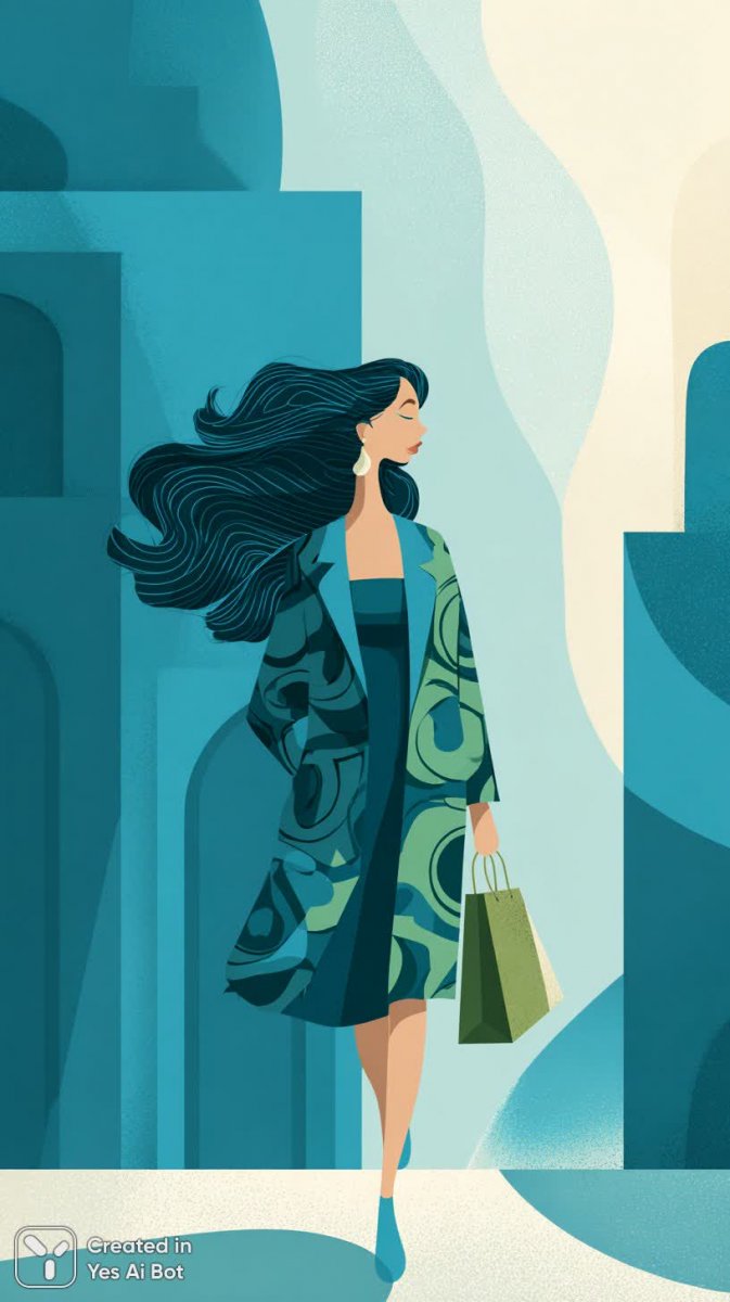 Элегантная женщина с длинными волнистыми волосами грациозно прогуливается по футуристическому городскому пейзажу, излучая уверенность и стиль. Ее наряд, сочетающий в себе глубокий синий и свежий зеленый цвета, украшен смелыми геометрическими узорами, создавая визуально привлекательный контраст. Верный спутник – маленький очаровательный пес – не отстает, добавляя нотку игривости в эту изысканную сцену. Городской фон выполнен в абстрактном стиле с использованием ярких цветов и чистых линий, подчеркивающих минималистичный дизайн иллюстрации. Вся композиция пронизана духом современного искусства, вдохновленного творчеством Керстен Ульве, известной своими лаконичными формами и выразительной цветовой палитрой. Это произведение – квинтэссенция современной моды и городского образа жизни, воплощенная в яркой и запоминающейся векторной иллюстрации. Кажется, что время замерло, позволяя зрителю насладиться красотой момента и ощутить гармонию между человеком, его питомцем и окружающим пространством. Иллюстрация передает ощущение легкости, свободы и безграничного вдохновения, характерного для мира высокой моды и современного дизайна