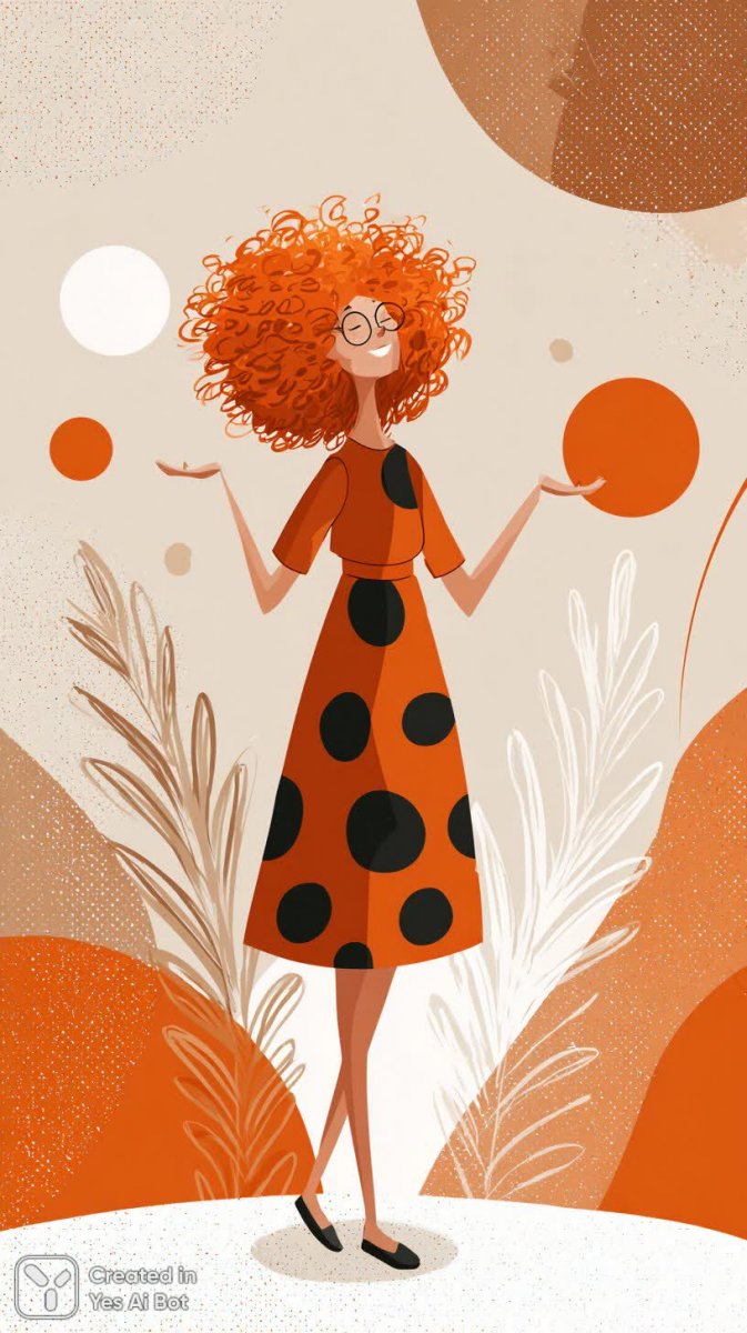 Яркая и энергичная иллюстрация в современном минималистичном стиле вдохновленная творчеством Кирстен Ульве. В центре композиции – стильная девушка с короткой кудрявой прической, чья кожа излучает сочный оранжевый оттенок. Она грациозно танцует на фоне красочных перьев, создавая динамичную и запоминающуюся картину движения. Девушка одета в купальник в горошек, добавляющий образу игривости и шарма. Визуальное оформление подчеркнуто геометрическими формами и нежными пастельными тонами, что придает работе легкость и воздушность. Использование плоской графики и векторного искусства делает изображение чистым и лаконичным, фокусируя внимание на выразительности персонажа и цветовой гамме. Эта иллюстрация идеально подойдет для оформления модных журналов, рекламных материалов или как оригинальный элемент дизайна интерьера, привнося в пространство атмосферу радости, креативности и современной эстетики. Работа отличается высоким качеством исполнения и вниманием к деталям, демонстрируя мастерство художника в создании визуально привлекательных и запоминающихся образов. Яркие цвета и динамичная поза девушки передают ощущение беззаботности и позитива
