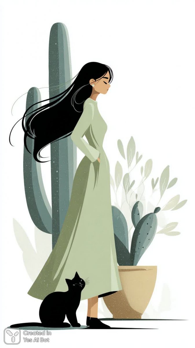 Нежная иллюстрация в минималистичном стиле передает атмосферу спокойствия и гармонии с природой. Изящная девушка с развевающимися волосами умиротворенно сидит рядом с величественным кактусом, символизирующим стойкость и красоту даже в самых суровых условиях. Черный кот, уютно свернувшийся к ее ногам, добавляет сцене тепла и домашнего очарования. Мягкая цветовая палитра создает ощущение легкости и воздушности, а белый фон подчеркивает графичность изображения. Современная иллюстрация выполнена в технике скетча, что придает ей особую живость и непосредственность. Эта работа станет прекрасным украшением интерьера или оригинальным подарком для ценителей минимализма и природы. Картина излучает спокойствие, умиротворение и дарит ощущение единения с окружающим миром. Это визуальное воплощение любви к кактусам и гармонии с собой. Сочетание элегантности девушки, монументальности растения и игривости кота создает неповторимый образ, наполненный светом и позитивом. Иллюстрация идеально подойдет для тех, кто ценит простоту форм и изысканность деталей. Она передает чувство внутренней свободы и связи с природой, напоминая о важности момента и умении находить красоту в обыденных вещах. Это современное произведение искусства станет ярким акцентом в любом пространстве