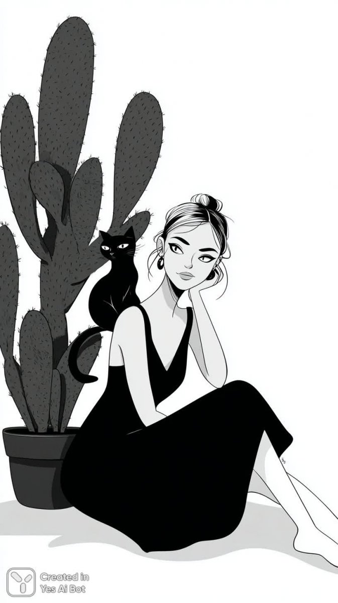 Изысканная девушка в черном платье нежно покоится рядом с величественным кактусом-гигантом, создавая атмосферу спокойной элегантности и утонченной красоты. На ее плече удобно расположился черный кот, добавляя композиции нотку загадочности и домашнего тепла. Изображение выполнено в минималистичном графическом стиле, с акцентом на чистые линии и гармоничные формы. Мягкая палитра пастельных тонов создает ощущение легкости и воздушности, а белоснежный фон подчеркивает чистоту и изысканность всей сцены. Современный эскиз передает современное видение красоты, сочетая в себе элементы классической элегантности и современной графики. Это завораживающая иллюстрация, которая демонстрирует гармонию между природой, животным миром и человеческим совершенством. Вся сцена пронизана умиротворением и тихой грацией, приглашая зрителя погрузиться в мир мечтаний и эстетического наслаждения. Единый стиль позволяет легко воспринимать изображение и создает ощущение целостности композиции. Безусловно, это произведение искусства способно украсить любое пространство и подарить хорошее настроение своей обладательнице