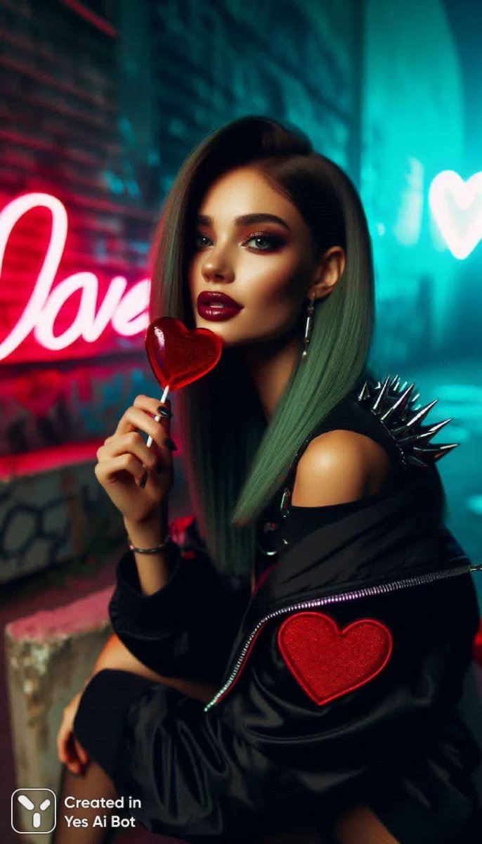На старом бетонном блоке расположилась девушка в стильном спортивном костюме и черной рубашке с шипами, ее длинные зеленые волосы ниспадают на плечи. Она держит в руках алое сердце – леденец, слегка прикусив его, оставляя след бордового цвета на губах. Мягкий вечерний свет проникает сквозь яркие неоновые граффити, создавая игру теней и оттенков розового и фиолетового, подчеркивающих высокую четкость деталей изображения. Девушка игриво смотрит через плечо с улыбкой, а размытый фон акцентирует внимание на ней, создавая атмосферу утонченного шика и привлекательности. Кадр излучает энергию, стиль и красоту, запечатленные с невероятной детализацией и резкостью, представляя собой визуальную историю, рассказанную языком света и цвета. Изображение выполнено в стиле реализма нейросетью DALL-E 3 по запросу, включающему элементы ретро-эстетики, киберпанка и уличной моды с использованием устаревшего снимка, эффекта игры теней и акцентом на 'love'.