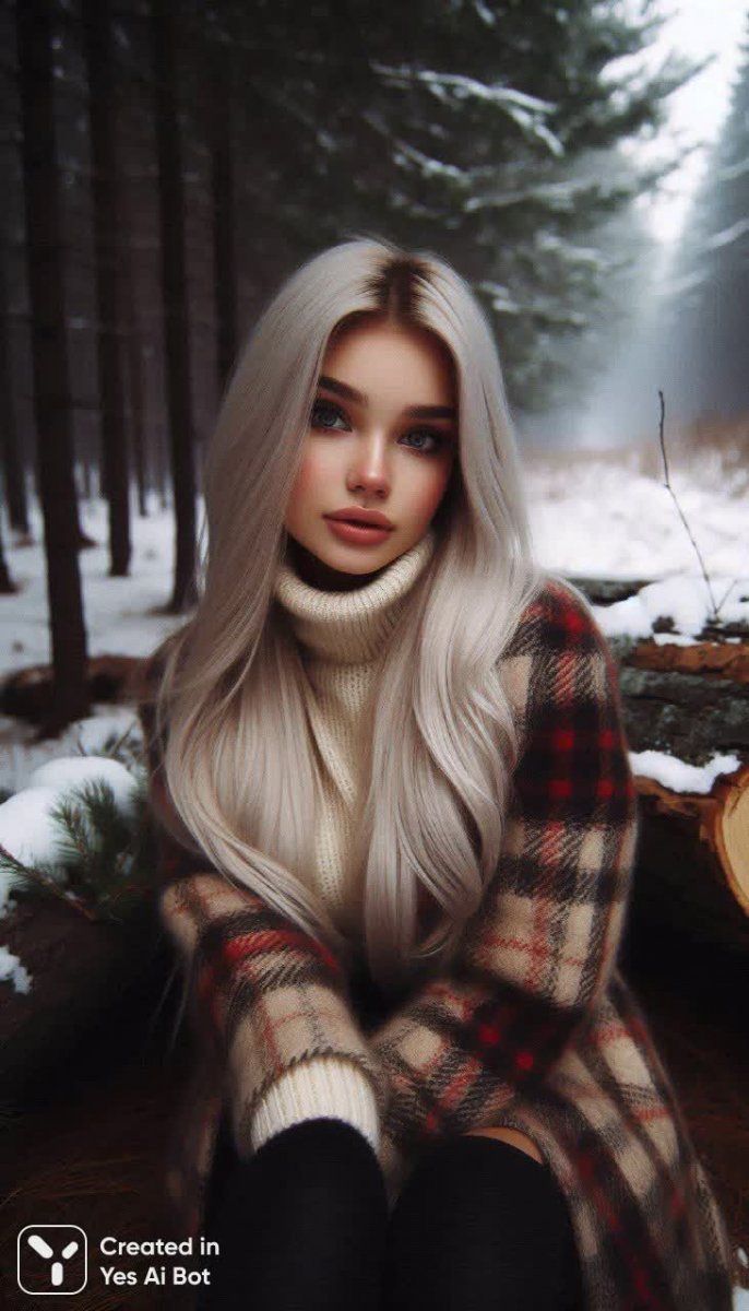 Загадочная красотка в объятиях зимнего леса запечатлена на пленке, словно сошедшая со страниц ретро-истории. Нечеткость кадра и мягкий эффект размытия лишь добавляют очарования этому старому снимку, окутанному полумраком и игрой теней. В центре композиции – прекрасная девушка с ниспадающими струями платиновых волос, облаченная в яркий свитер в стиле 'плед', который словно вырывается из монохромной палитры зимнего пейзажа. Она грациозно расположилась на бревне, окруженная заснеженными елями и деревьями, увенчанными белоснежными шапками. За ней едва заметно струится легкий дымок, словно от костра или воспоминаний, а взгляд ее чуть прищурен, добавляя образу загадочности и задумчивости. Темные губы слегка тронуты улыбкой, выражающей безмятежность и внутреннюю гармонию. Спортивные брюки сочетаются с элегантными аксессуарами и теплыми белыми перчатками, подчеркивая ее утонченный стиль. Зимняя тишина окутывает это место, создавая атмосферу спокойствия и уединения. Фотография отличается повышенной четкостью и глубиной резкости, а контраст между светлыми и темными тонами усиливает драматизм сцены. Спокойные зимние цвета подчеркивают естественную красоту пейзажа и гармонию с образом девушки. Мягкое освещение вдали и деликатные блики света создают ощущение тепла и уюта. Старинные фотоэффекты и эффект проявления придают снимку неповторимый шарм, а теплота, исходящая от изображения, согревает душу зрителя, словно воспоминание о счастливом моменте, запечатленном во времени