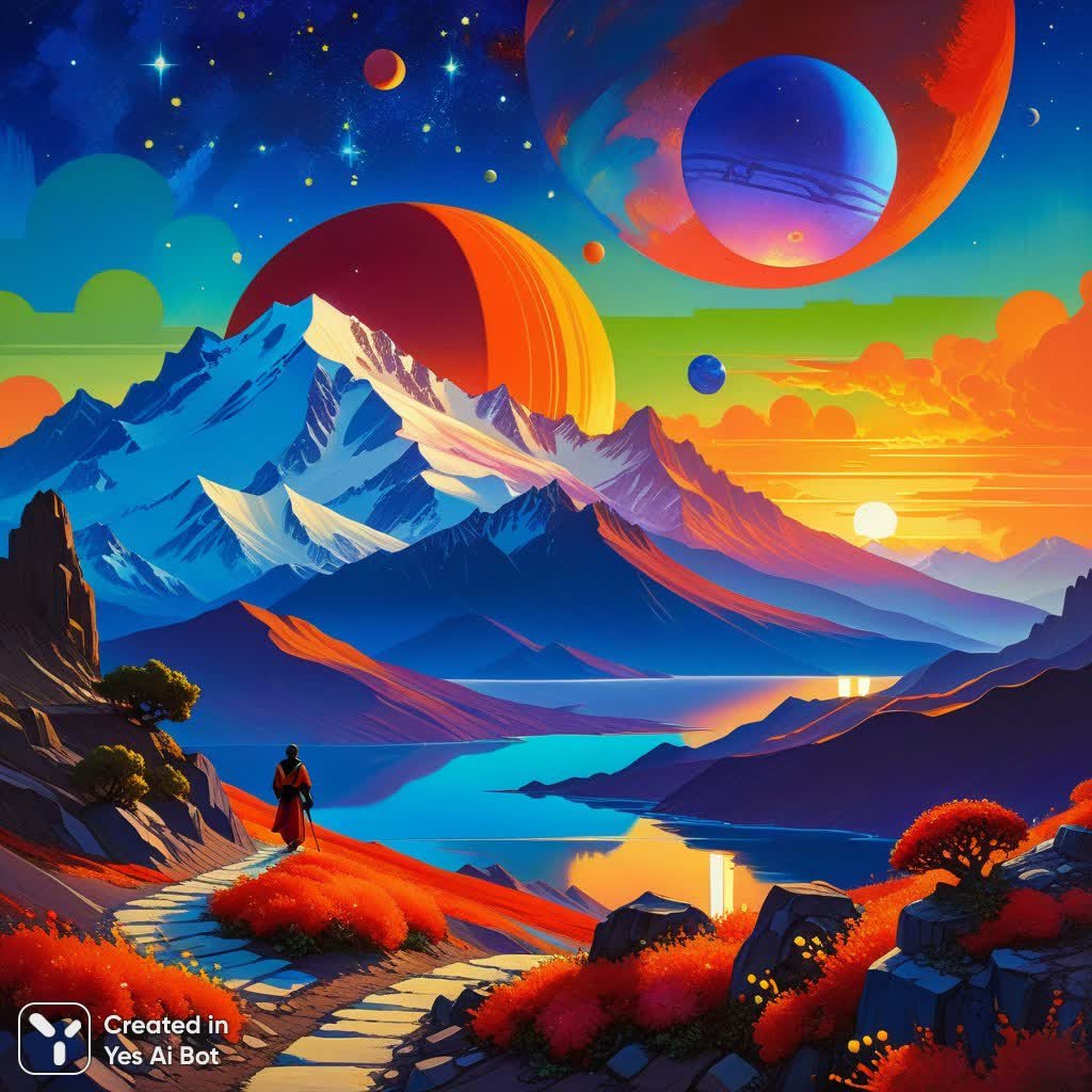 Захватывающий дух пейзаж инопланетной двойственности, где буйство красок танзанита и перидота сливается в эпическом закате над раскаленным Юпитером. Мощная багровая полоса пересекает небесный свод, добавляя драматизма этому космическому зрелищу. Вдали возвышается планета Венера, усеянная гигантскими горами-тессерами, среди которых выделяется Антропос – величественный пик, словно вырезанный рукой архитектора вселенной. Под этими каменными исполинами простирается красочное море, населенное причудливыми морскими огурцами и грациозными скатами. Картина оживает деталями осеннего цветения, передавая ощущение тепла и умиротворения. Изображение выполнено в разрешении 256k пикселей, что позволяет рассмотреть мельчайшие элементы геометрического стиля и математической структуры пространства. Весь мир предстает как сложная поверхность, состоящая из плоских фигур, создающих ощущение глубины и перспективы. В композиции ощущается гул Юпитера и величие гор, выполненных в стиле Николая Рериха – с его характерной любовью к мистике и духовности. Атмосфера пронизана утопическими мотивами, передающими чувство надежды и гармонии. Вся сцена словно является огненным танцем фейерверков, исполняемым в вальсе, вдохновленном принципами супрематизма и авангарда. Высокая резкость изображения позволяет полностью погрузиться в этот фантастический мир, ощутить его энергию и красоту. Это произведение искусства – гимн космической гармонии и безграничному воображению