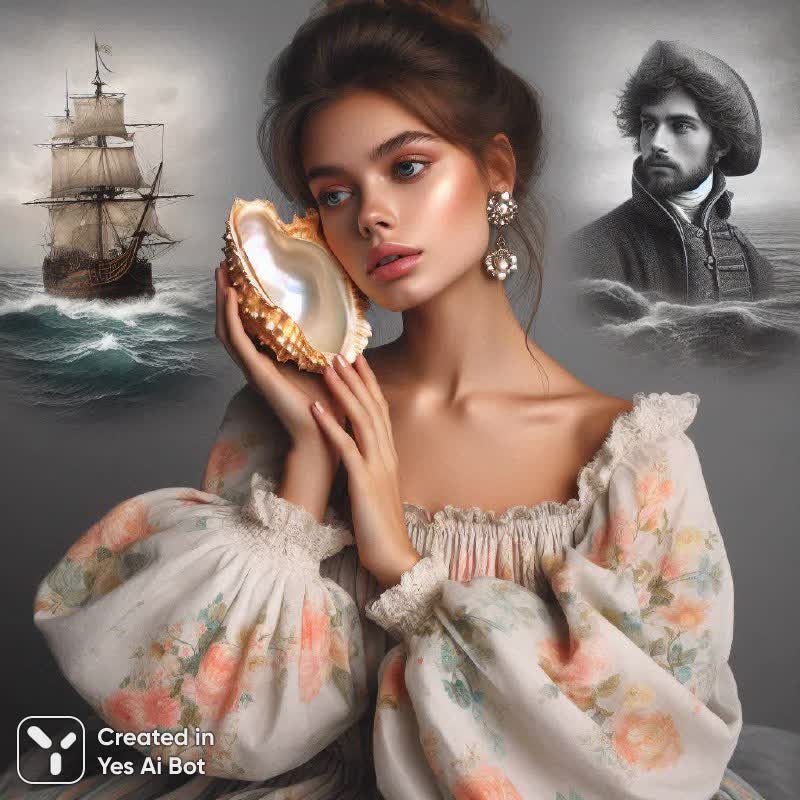 Загадочная красота, сотканная из воспоминаний и грёз. Нежная девушка с длинными, светлыми волосами, собранными в небрежный пучок, словно сошедшая со страниц романтической новеллы, застыла в моменте безмятежной гармонии с природой. Её лёгкое платье из полупрозрачной ткани, украшенное пастельным цветочным узором – персиковый, бледно-зелёный и нежно-жёлтый – струится вокруг фигуры, словно морской бриз. Короткие, воздушные рукава добавляют образу легкости и хрупкости. Она прижимает к уху крупую раковину из бежевого цвета с перламутровым отливом, пытаясь уловить шепот моря. Полуприкрытые глаза и лёгкая, задумчивая улыбка на её лице отражают глубокие размышления и переживания. Её взгляд словно погружён в мир грез, где переплетаются образы прошлого: старинный парусник, рассекающий волны бушующего моря, портрет бесстрашного пирата с горящими глазами и сияющие жемчужины, символизирующие богатство и тайну. Этот двойной кадр – это поэтичное сочетание реальности и фантазии, хрупкости и силы, нежности и мужества. Это история о любви к морю, о приключениях, о потерянных надеждах и вечных мечтах. В этом образе чувствуется дуновение времени, словно девушка является хранительницей древних тайн и свидетелем великих событий. Она – олицетворение женственности, загадочности и внутренней силы, способной противостоять любым штормам. Это визуальный гимн красоте, мужеству и вечной связи человека с океаном