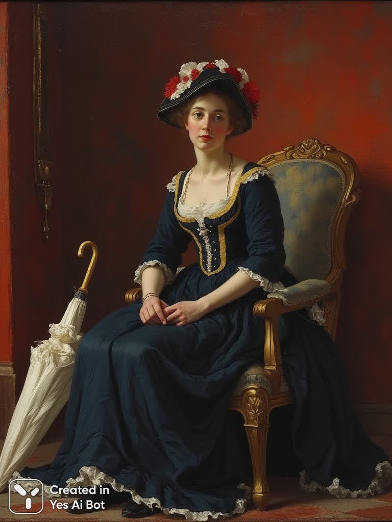 Изысканный портрет эпохи позднего XIX века запечатлел европейскую аристократку в момент задумчивости. Молодая женщина, приблизительно тридцати лет, облачена в элегантное темно-синее платье с богато украшенным корсажем, расшитым золотом, и пышной юбкой, оживленной белоснежными воланами. На голове – изящная шляпка, украшенная акцентами красного и белого цветов, завершающая образ утонченной элегантности. Лицо модели отличается нежной красотой, сдержанным выражением и слегка опущенной головой, что придает портрету атмосферу загадочности и меланхолии. Она грациозно расположилась в кресле с позолоченным каркасом и синим обтяжком, а рядом полуоткрытым зонтом дополняет композицию. Интерьер комнаты характеризуется фактурными красными стенами, создающими ощущение тепла и уюта. Мягкое, рассеянное освещение формирует едва заметные тени, подчеркивая глубину и атмосферность произведения. Художественный стиль картины выполнен в духе импрессионизма, с использованием мягких мазков кисти и приглушенной цветовой палитры. Картина передает ощущение спокойного созерцания, возможно, с легким налетом ностальгии по ушедшей эпохе. Общий настрой работы – это тихая элегия, посвященная красоте, достоинству и неповторимости женского образа в эпоху перемен. Наблюдатель погружается в атмосферу аристократической жизни, ощущая тонкую грань между реальностью и воспоминанием