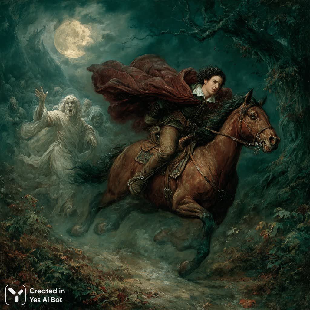 Ночная погоня в заколдованном лесу, сотканная из теней и лунного света, разворачивается как драматическая сцена из древней легенды. Молодой человек, едва достигший двадцатилетия, с копной рыжевато-коричневых волос, несется на верном коне цвета темного шоколада. Его стремительный бег влево, в глубину леса, подчеркивает отчаяние и спешку, а скромная коричневая одежда для верховой езды контрастирует с развевающейся бордовой накидкой, словно пламенем рисующей его движение по сумраку. Конь – воплощение мощи и грации, широко расставив ноги, он мчится вперед, демонстрируя невероятную скорость и выносливость. За ним, в полумраке леса, возникает призрачная фигура: женщина в струящемся белом платье с бледным, почти невидимым лицом, тянущая к нему руку, словно пытаясь удержать или предупредить. Из зарослей деревьев, скрываясь в тенях и переплетаясь с лунным светом, появляются еще несколько фигур – светлых, одетых в легкие одежды, их лица едва различимы в полумраке, а силуэты сливаются с окружающей средой. Лес, где разворачивается эта захватывающая сцена, мрачен и таинственен: корявые деревья тянутся к небу словно скрюченные пальцы, а земля устлана приглушенными оттенками зеленого и коричневого, создавая атмосферу тревоги и ожидания. Луна, словно свидетель происходящего, щедро одаривает сцену своим теплым светом, выделяя бегущего всадника на коне и подчеркивая контраст между тьмой леса и ярким лунным сиянием. Вся картина пронизана духом сказки и романтики, а мазки кисти передают ощущение движения и напряжения. Общее настроение – это смесь страха и тревоги, усиленная присутствием темных сил и едва уловимого ощущения сверхъестественного. Эта сцена словно застывший кадр из волшебной истории, где опасность подстерегает на каждом шагу, а судьба бегущего всадника висит на волоске