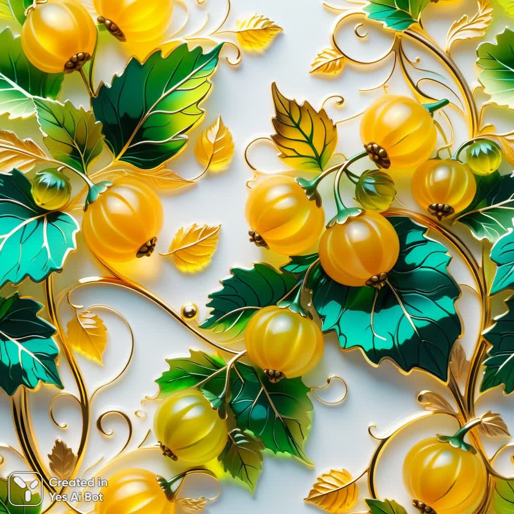 stable diffusion Неожиданное сочетание: желтые крыжовники и изумрудные листья в золотом обрамлении. Картинка из нейросети Stable Diffusion