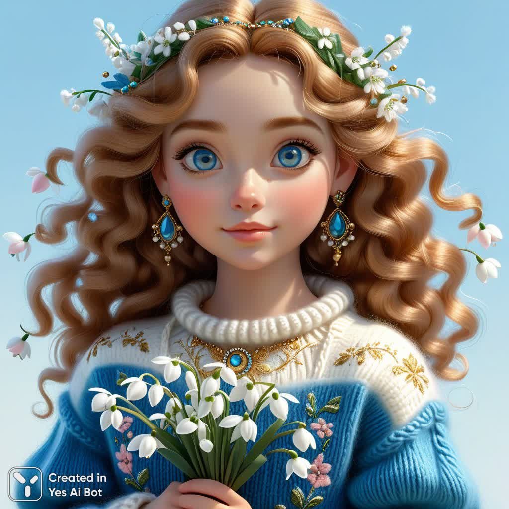 Нежная акварель в духе наивного искусства и эстетики Pixar. На чистом белом фоне запечатлена очаровательная девушка с небесно-голубыми глазами, излучающая тепло и безмятежность. В ее руках – букет белоснежных подснежников, символизирующий приход весны и пробуждение природы. Одета она в уютный вязаный свитер из мохера, дополненный джинсами и белыми кроссовками, создавая расслабленный и повседневный образ. Вокруг девушки простирается бескрайнее голубое небо, добавляя картине ощущения простора и легкости. Детализированные элементы, такие как бусы, кудрявые волосы, золотые и серебряные акценты, придают образу изысканность и индивидуальность. Использование палитры нежных оттенков – голубого, розового, оливкового и белого – подчеркивает чистоту и наивность сюжета. Тонкая вышивка на свитере добавляет текстуру и визуальный интерес. Вся композиция выполнена в характерной манере наивного искусства с его простотой форм и акцентом на деталях, а стиль Pixar студии привносит ощущение волшебства и сказки. Картина вызывает чувство умиления и нежности, словно заглядывая в мир детских грез и беззаботных радостей. Это идеальное сочетание тепла, света и чистоты, воплощенное в ярком и запоминающемся образе