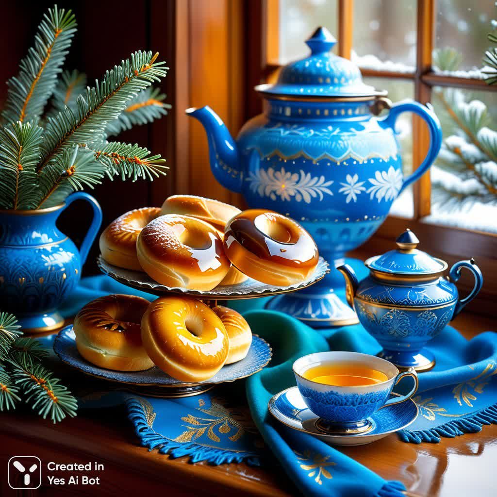 The samovar, painted with frosty blue patterns, shines like a magical vessel. Steam from the hot tea rises up, creating an atmosphere of coziness. Golden pastries and bagels look like gifts from a magic tablecloth. Green pine needles in the vase remind of the forest outside the window. Sunbeams play on the glaze of the buns and the glass of the honey jar. The contrast between the cold blue of the patterns and the warm color of wood and bread creates harmony. The picture radiates kindness, prosperity, and the joy of a new day. No inscriptions.