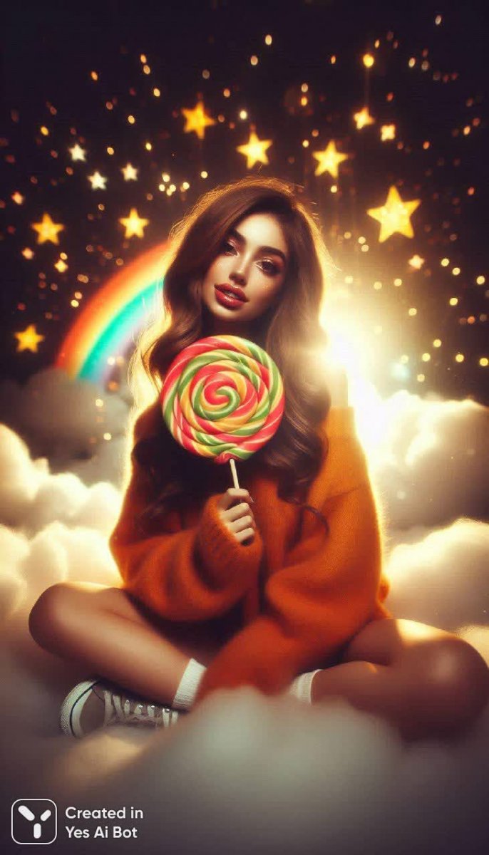 Завораживающая мечтательность пленяет взгляд: девушка словно сошла с полотна сказочного мира, паря на пушистом облаке в объятиях ночи. Ее длинные каштановые волосы струятся вокруг лица, подчеркивая нежность и утонченность образа, а яркий оранжевый свитер создает контраст с белоснежными леггинсами и уютными серыми ботинками. В руках она держит гигантский леденец в форме звезды, излучающий волшебное сияние, словно воплощение сладких грез. Фон картины – это фантастическое полотно, где радуга переплетается со светящимися звездами, создавая атмосферу сказочного волшебства и безграничной свободы. Акцент на деталях позволяет рассмотреть каждый штрих: чувственные губы, украшенные ягодным блеском, игривый взгляд, полный загадок, креативные текстуры, мягкие цветовые переходы и изысканные аксессуары, дополняющие неповторимый стиль. Смешение различных направлений – от готики до минимализма – создает уникальную эстетику, а нежная палитра и высокая контрастность с мотивами природы добавляют композиции глубины и эмоциональности. Вся картина пронизана атмосферой весны и волшебства, оставляя ощущение легкости, радости и бесконечной сказки, запечатленной в пленке времени. Это визуальная ода красоте, нежности и безграничному воображению