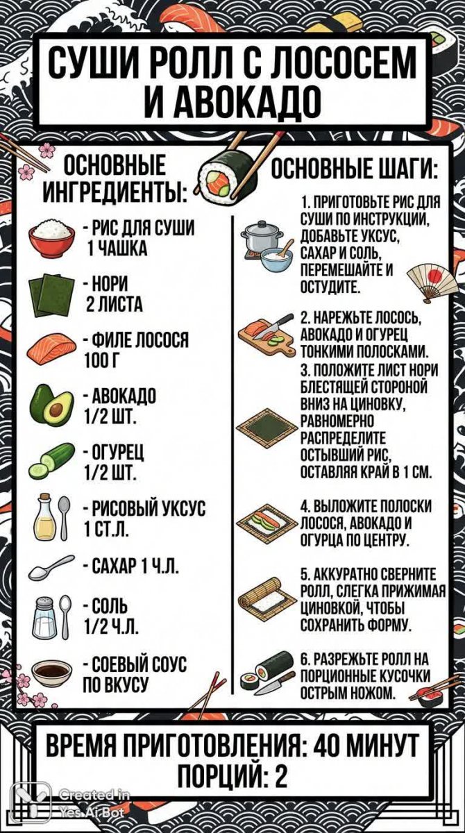 Вкусный суши ролл с лососем и авокадо: пошаговый рецепт приготовления дома для всей семьи - Пример работы нейросети Нано Банана