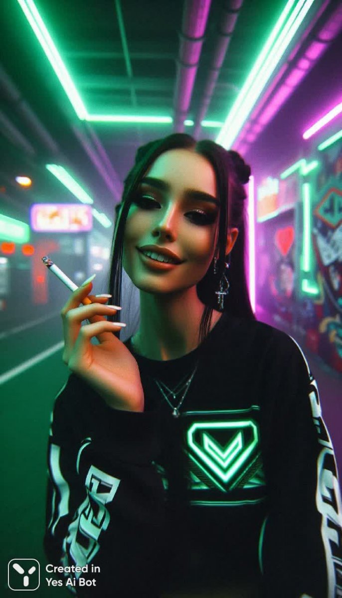 Ночная элегия в неоновых тонах – завораживающая фотография на пленку, пропитанная атмосферой киберпанка и легкой меланхолии. Размытость кадра, созданная использованием старой пленки, добавляет изображению винтажной эстетики и загадочности. В центре композиции – стильная девушка, воплощение современной красоты и уверенности. Ее длинные каштановые волосы, собранные в черные дреды, контрастируют с нежностью светлого зеленого фона, создавая яркий визуальный акцент. Спортивная одежда подчеркивает ее динамичность, а неоновый логотип на черной футболке добавляет футуристичности образу. Слегка готический стиль проявляется в деталях – яркие губы цвета марсала и игривый прищур придают лицу выразительности. Сигарета в руках становится символом бунтарства и свободы, а милая улыбка – намеком на внутренний мир этой загадочной женщины. Спортивная машина с черными и желтыми полосами служит идеальным фоном для этой атмосферной сцены. Граффити в стиле киберпанк, смешанные с яркими зелеными и пурпурными оттенками, создают эффектный контраст и усиливают общее впечатление от фотографии. Использование минимализма в композиции позволяет выделить главную героиню, а детализированный фон добавляет глубины и реалистичности изображению. Игра света и тени создает ощущение движения и динамики, подчеркивая игривое настроение и легкую романтику этой ночной истории. Повышенная четкость и глубокое поле зрения позволяют рассмотреть каждую деталь, от текстуры волос до утонченных элементов одежды. Эта фотография – не просто снимок, а целое произведение искусства, сочетающее в себе красоту, стиль и атмосферу