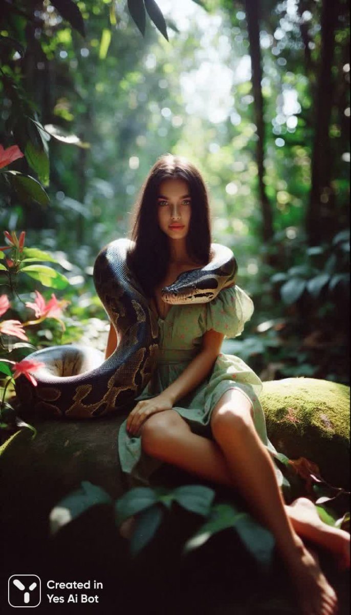 Загадочное фото, словно сошедшее со страниц старинного журнала о путешествиях. Пленка хранит тепло забытого дня в сердце густого тропического леса, где царит игра света и тени. В центре композиции – прекрасная девушка с длинными, струящимися темными волосами, облаченная в легкое зеленое платье, украшенное изящным цветочным узором. Она восседает на массивном камне, окруженная буйством тропической растительности: экзотическими цветами, густыми лианами и пышной зеленью. Необычный аккомпанемент этой картины – огромная анаконда, нежно извивающаяся у нее на плечах. Глаза девушки, полные уверенности и спокойствия, отражают гармонию с окружающим миром. Легкая дымка размытия создает эффект живого кадра, а увеличенная глубина резкости позволяет рассмотреть каждую деталь: от нежных оттенков зелени до яркой палитры тропических цветов, создающих завораживающий контраст. Теплый солнечный свет пробивается сквозь листву, окутывая сцену мягким сиянием и подчеркивая красоту девушки, ее улыбку и развевающиеся на ветру волосы. Вся композиция излучает мощь, загадочность и неповторимое очарование дикой природы, создавая ощущение сказочного тропического пейзажа, где человек и природа сливаются в единое целое. Контрастные фактуры платья и кожи добавляют выразительности изображению, делая его визуально богатым и запоминающимся