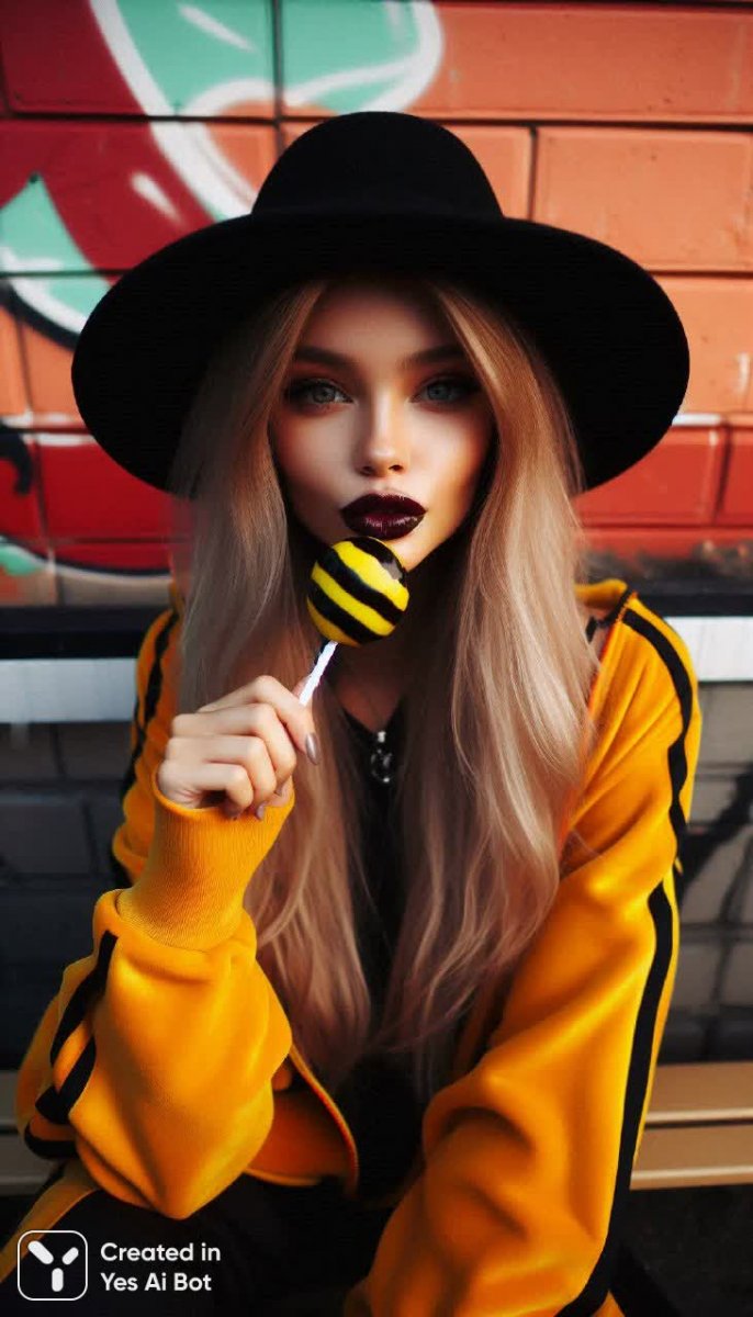 Завораживающая пленка прошлого оживает в этом снимке, где время словно застыло в моменте утонченной красоты. Нечеткость изображения лишь подчеркивает его винтажную атмосферу, создавая игру света и тени, придающую изображению загадочность и шарм. В центре внимания – очаровательная девушка с длинными, идеально прямыми светлыми волосами, воплощение стиля и грации. Яркий спортивный костюм выделяет ее на фоне оранжевой стены, украшенной яркими граффити, создавая неожиданный, но гармоничный контраст. В руках она держит большой черный и желтый полосатый карамельный леденец – деталь, добавляющая образу игривости и беззаботности. Черная неформальная шляпа придает ей индивидуальности, а глубокие бордовые губы и милая гримаска излучают обаяние и непосредственность. Крупный план позволяет рассмотреть мельчайшие детали: мягкое освещение создает ощущение уюта, а легкая неразборчивость фона лишь усиливает загадочность снимка. Вся композиция пронизана весенним настроением, яркими контрастами и изящным стилем. Увеличенная четкость и высокая детализация позволяют оценить красоту аксессуаров и утренний свет, который деликатно подсвечивает образ. Это не просто фотография – это запечатленная история о молодой девушке с веселым настроением, нежной улыбкой и неповторимой индивидуальностью, отраженной в обрамлении цветных теней. Снимок словно шепчет о времени беззаботности и стиля, оставляя ощущение тепла и уюта