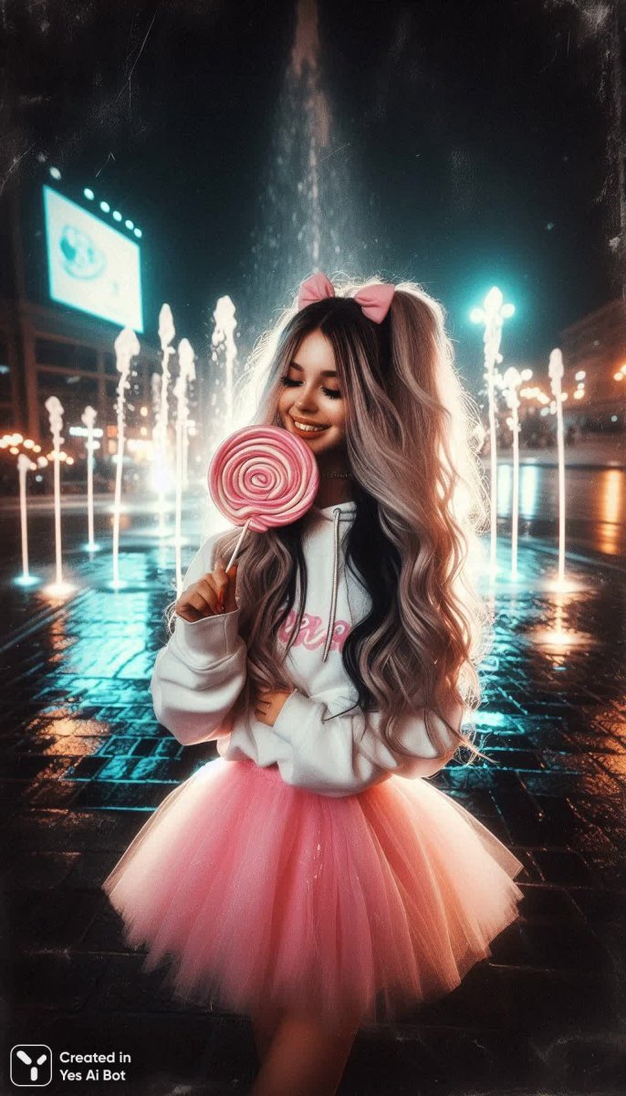 фото на пленке, старая затертая фотография, игра теней, в ночи размыто, эффект вспышки, очень красивая девушка, длинные светлые волосы с черными прядями, на ней пышная юбка цвета розового сахара и белая толстовка с капюшоном, рядом с ней громкий фонтан с яркими струями воды, она мило улыбается, в руках большой круглой леденец на палочке в виде облака, на фоне яркий неоновый городской пейзаж с огнями и граффити, эффекты размытия, текстура жемчужного фона, контрастные тени, глубокая резкость, насыщенные цвета, создающие атмосферу магического реализма, ее губы темно-вишневые, а на запястьях стильные браслеты, в глазах искорки развлекательной эйфории, образ почти мистический, словно пришедший из снов, добавляя нотки веселья и дерзости.