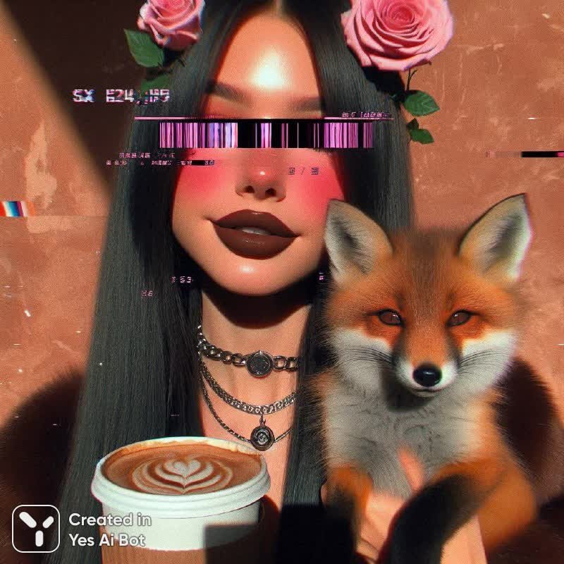 Лиса с девушкой: кофейный глитч и роза на фоне ужаса - Картинка из нейросети Dalle