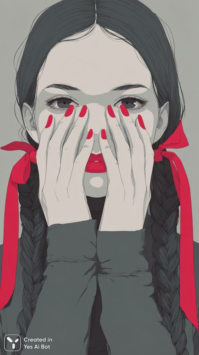 girl in gray turtleneck, face partially covered by hair, long braids tied with red ribbons, bright red nails and lips, sitting with hands framing face, soft shadows, detailed close-up, neutral background, modern art.