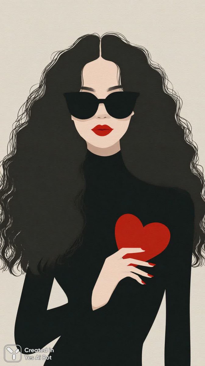 Изящная девушка с роскошными волнистыми волосами, ниспадающими мягкими струями, приковывает взгляд своей безупречной красотой и чувственностью. Яркий акцент в её образе – насыщенный оттенок красной помады на губах и идеально подобранный маникюр, создающий гармоничный ансамбль. Крупные черные солнцезащитные очки добавляют образу загадочности и стиля, подчеркивая индивидуальность модели. Она одета в элегантный черный водолазный свитер, который лаконично завершает образ, выделяя изящную линию шеи и плеч. В руках девушка держит милую табличку в форме сердца, прижатую к лицу, словно хранящий секрет или выражающий нежные чувства. Композиция пронизана яркими, насыщенными цветами, создающими эффектное визуальное восприятие. Выразительное настроение модели передается через её взгляд и легкую улыбку, наполняя кадр позитивом и энергией. Графичный стиль изображения придает работе современность и динамичность, делая её запоминающейся и привлекательной. Этот портрет – воплощение женственности, стиля и эмоциональности, запечатленное в ярких красках и графических деталях. Картина излучает уверенность, обаяние и неповторимый шарм своей героини