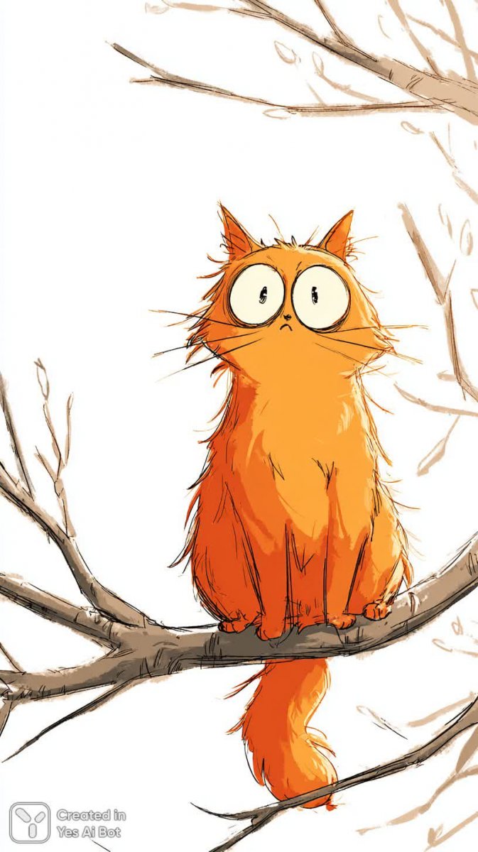 Удивленный рыжий котенок на ветке дерева в мультяшном стиле - Результат работы нейросети Миджорни
