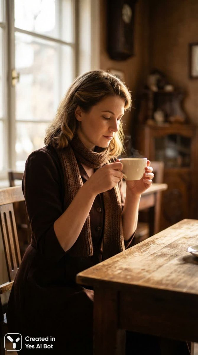 scene_summary: a woman in vintage attire sits at a cozy wooden table in a cafe, sunlight casting a soft glow, wearing a dress in deep chocolate tones (#381E1F), with a milk chocolate scarf (#A97456), a porcelain white cup (#F5E6CC) in hand, golden brown highlights (#916953) in the background, warm and inviting mood, shallow depth of field, realistic textures, cinematic composition, no text, no watermark.